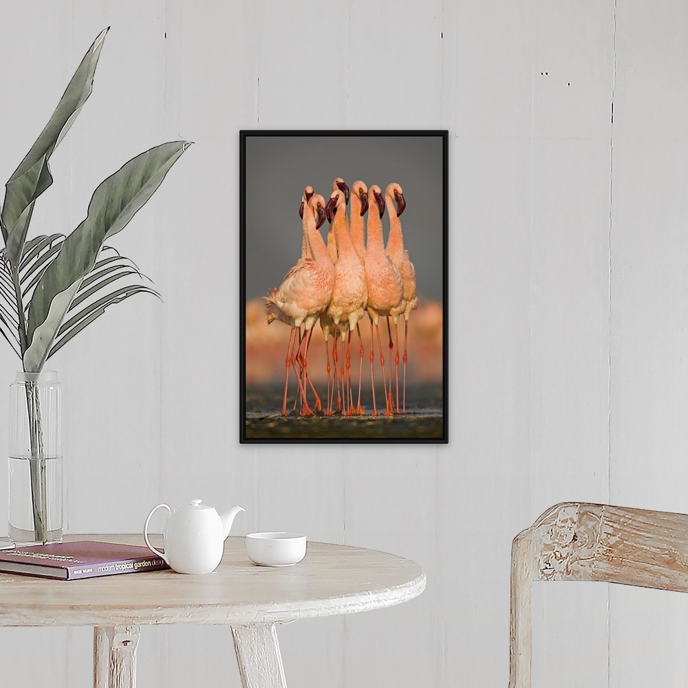 "Flock of eight flamingos wading in water, Lake Nakuru, Kenya" Black Float Frame Canvas Art