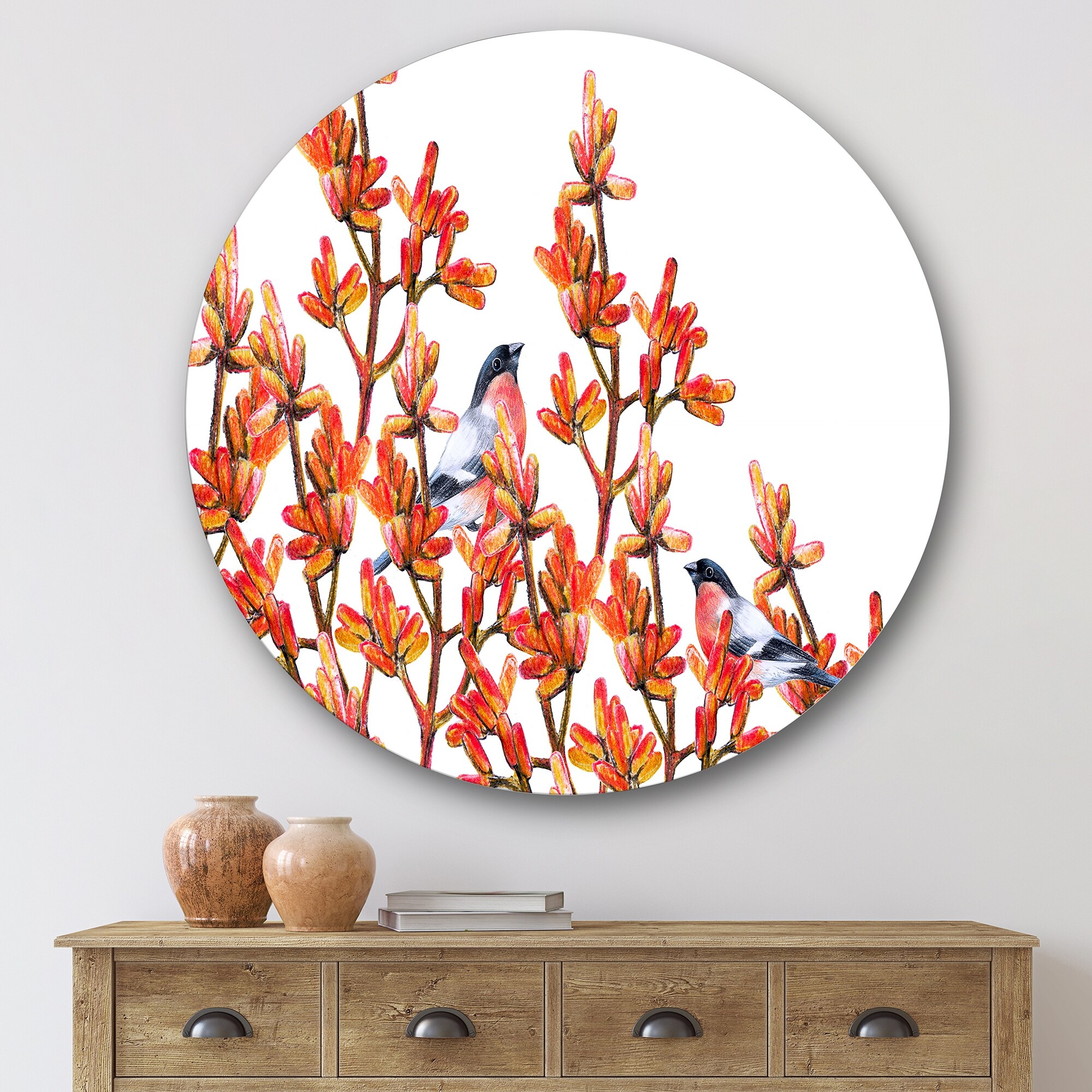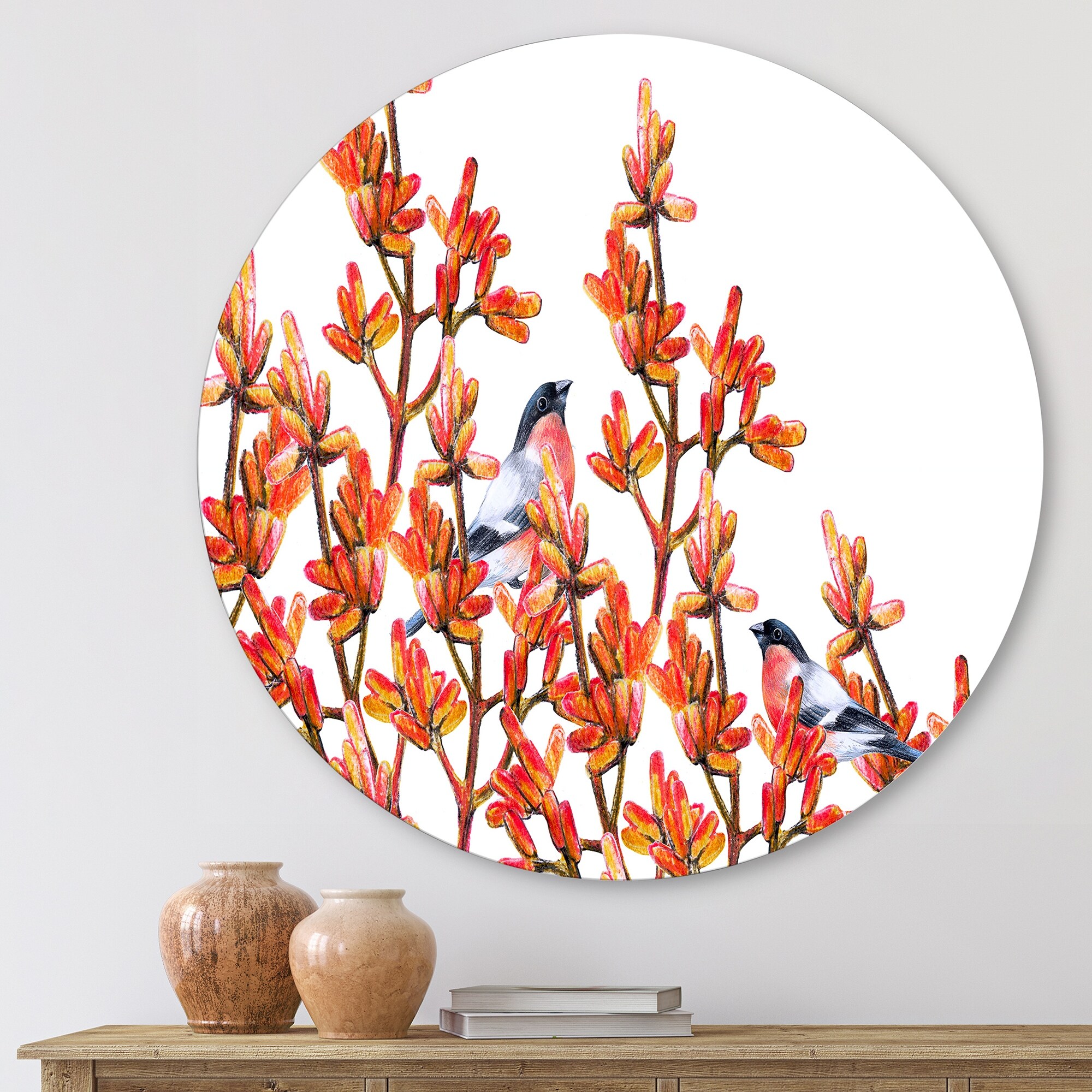 Designart 'Flock of Bullfinches Birds on Orange Branches' Traditional Metal Circle Wall Art