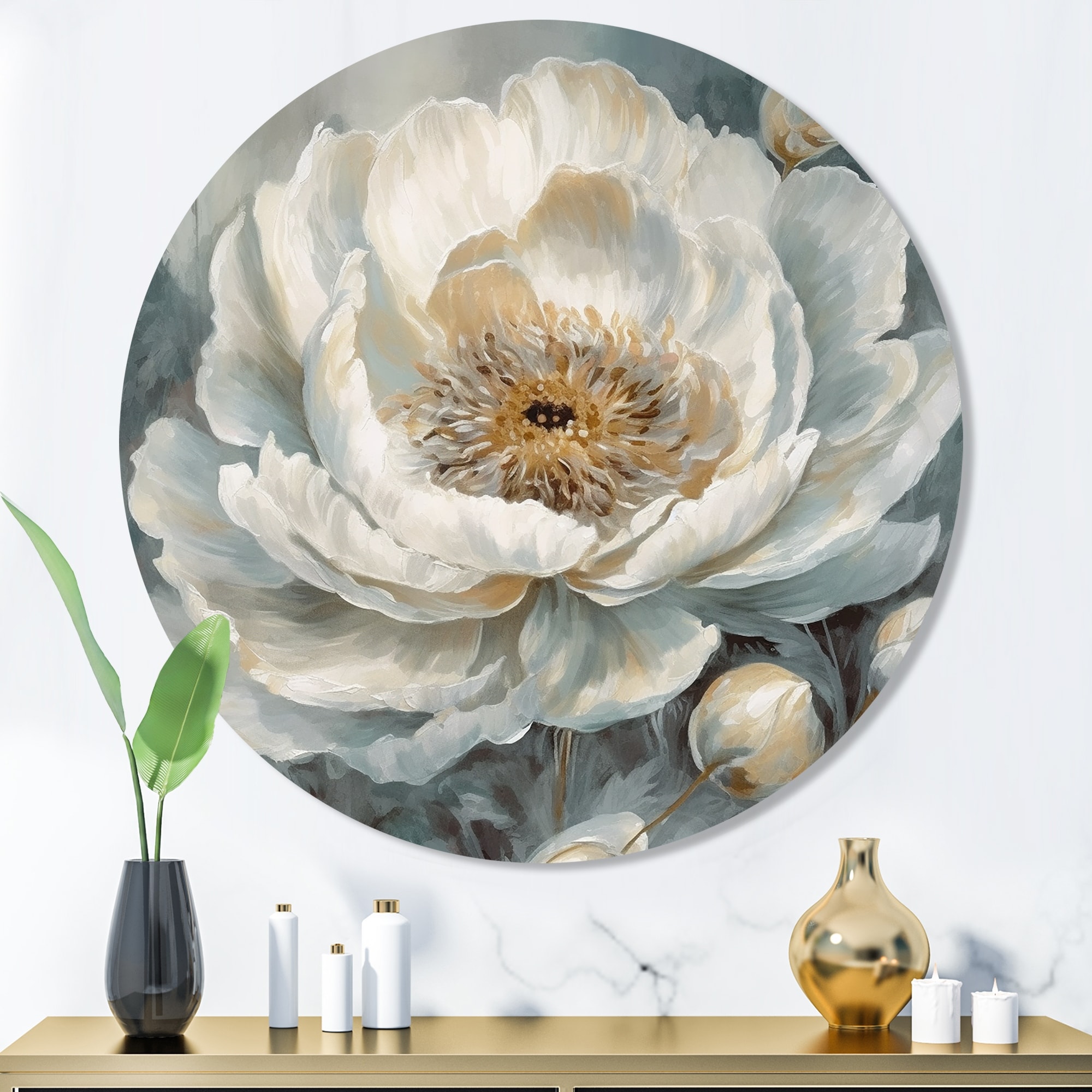 Designart "White Blue Peonies Symphony II" Floral Peony Metal Round Wall Art