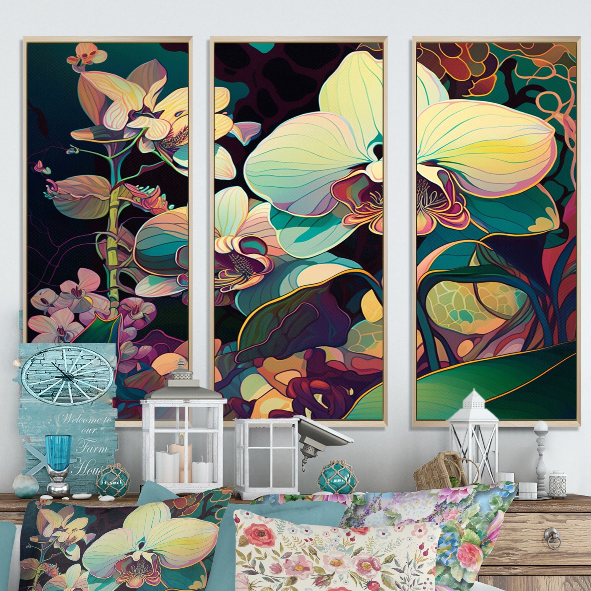 Designart "Blossoming Orchid in Bright Retro Colors IX" Floral Orchid Framed Canvas Wall Art Print - 3 Panels