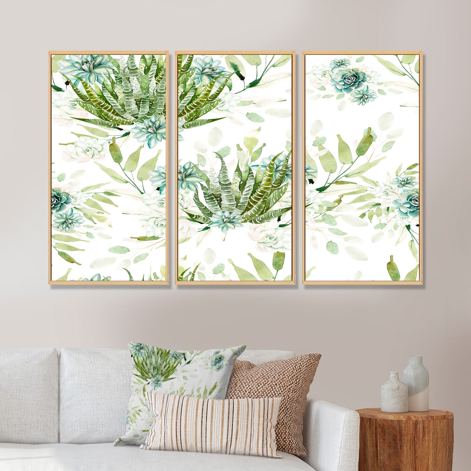 Designart "Cacti And Succulents on White" Patterned Framed Canvas Wall Art Set of 3 - 4 Colors of Frames