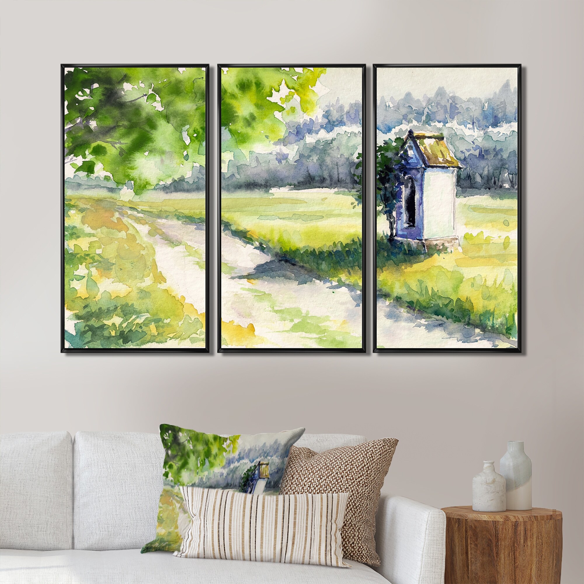 Designart "Little Chapel Next to Countryroad" Country Framed Canvas Wall Art Print Set of 3 - 4 Colors of Frames
