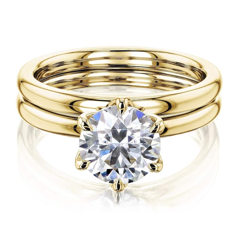 Kobelli 1.50 Carat Moissanite 14k Solid Gold Round Solitaire 6-Prong Tulip Comfort Fit Plain Bands Kyoto 2pc Bridal Set
