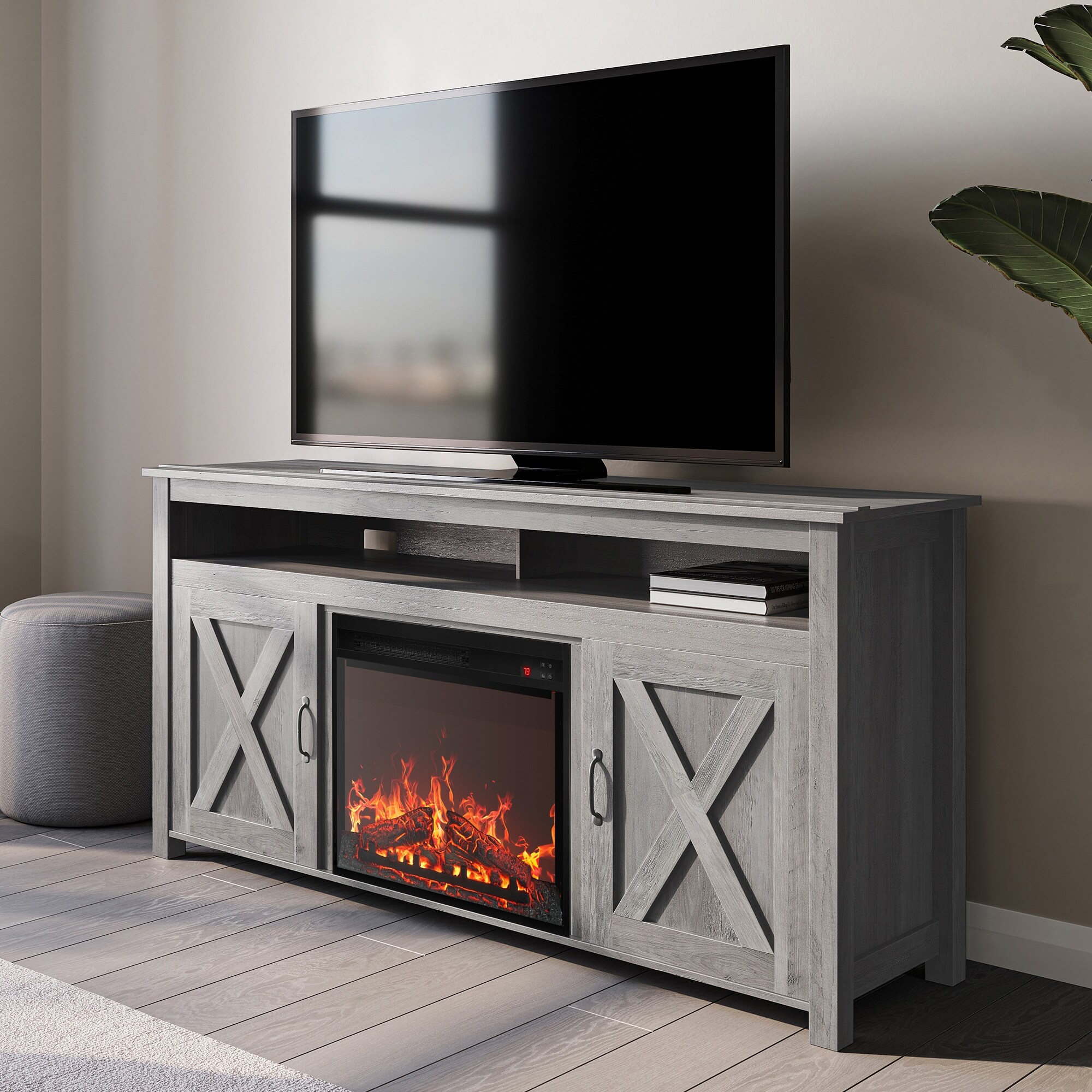 BELLEZE 58" Wood TV Stand W/ 23" Fireplace & Storage