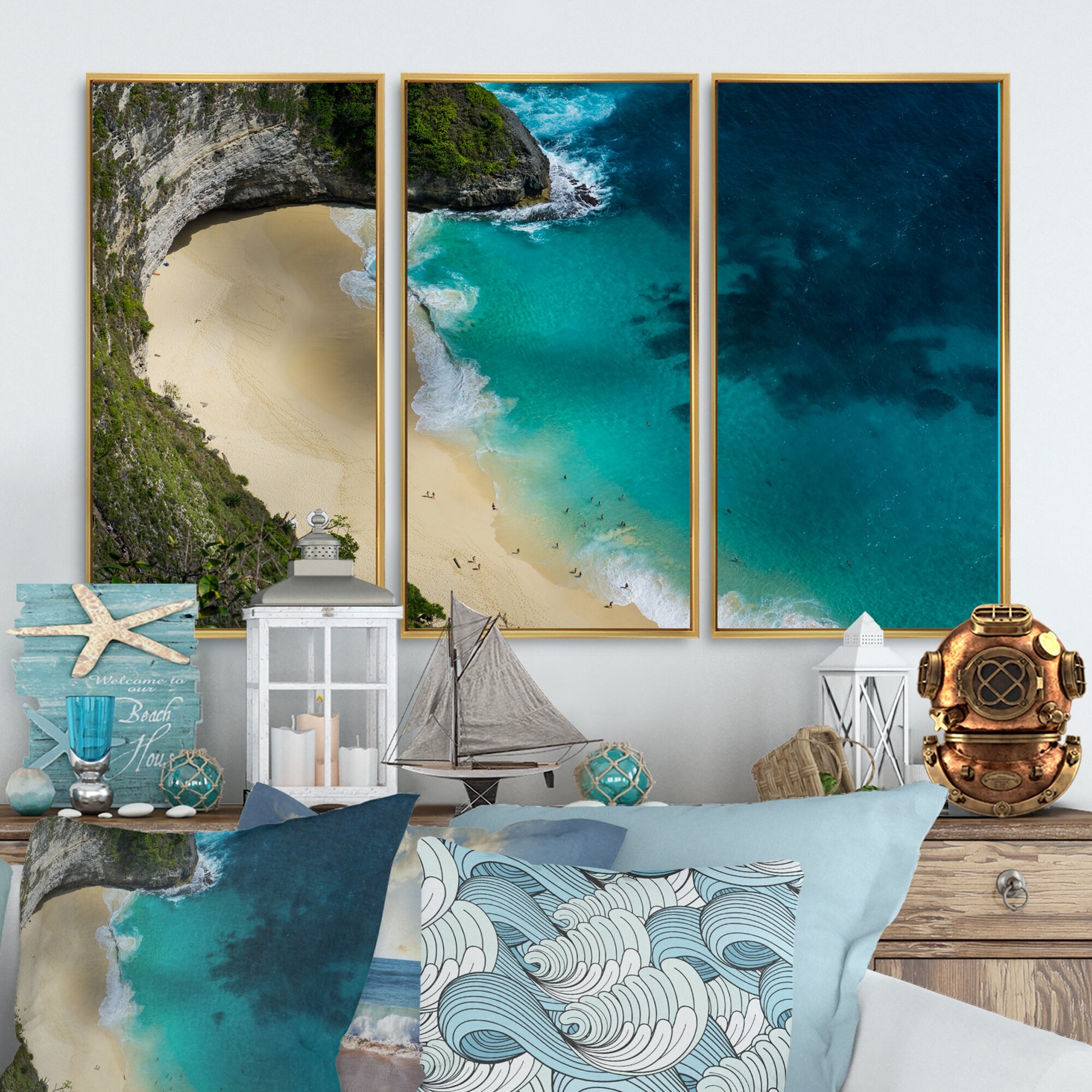 Designart "Aerial View of Blue Ocean Beach" Nautical & Coastal Framed Art Set of 3 - 4 Colors of Frames
