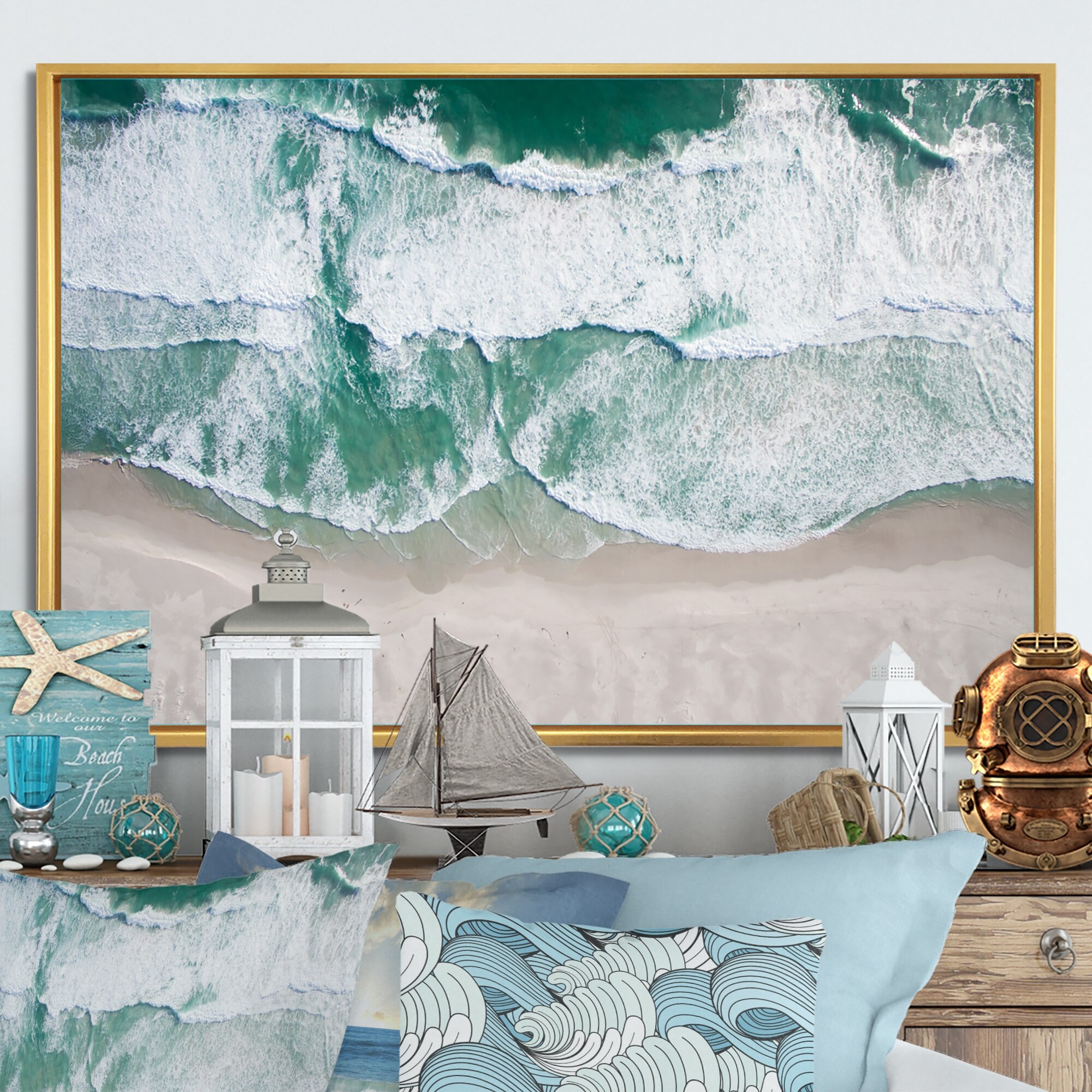Designart "Aerial View Blue Ocean Waves II" Nautical & Coastal Framed Canvas Wall Art