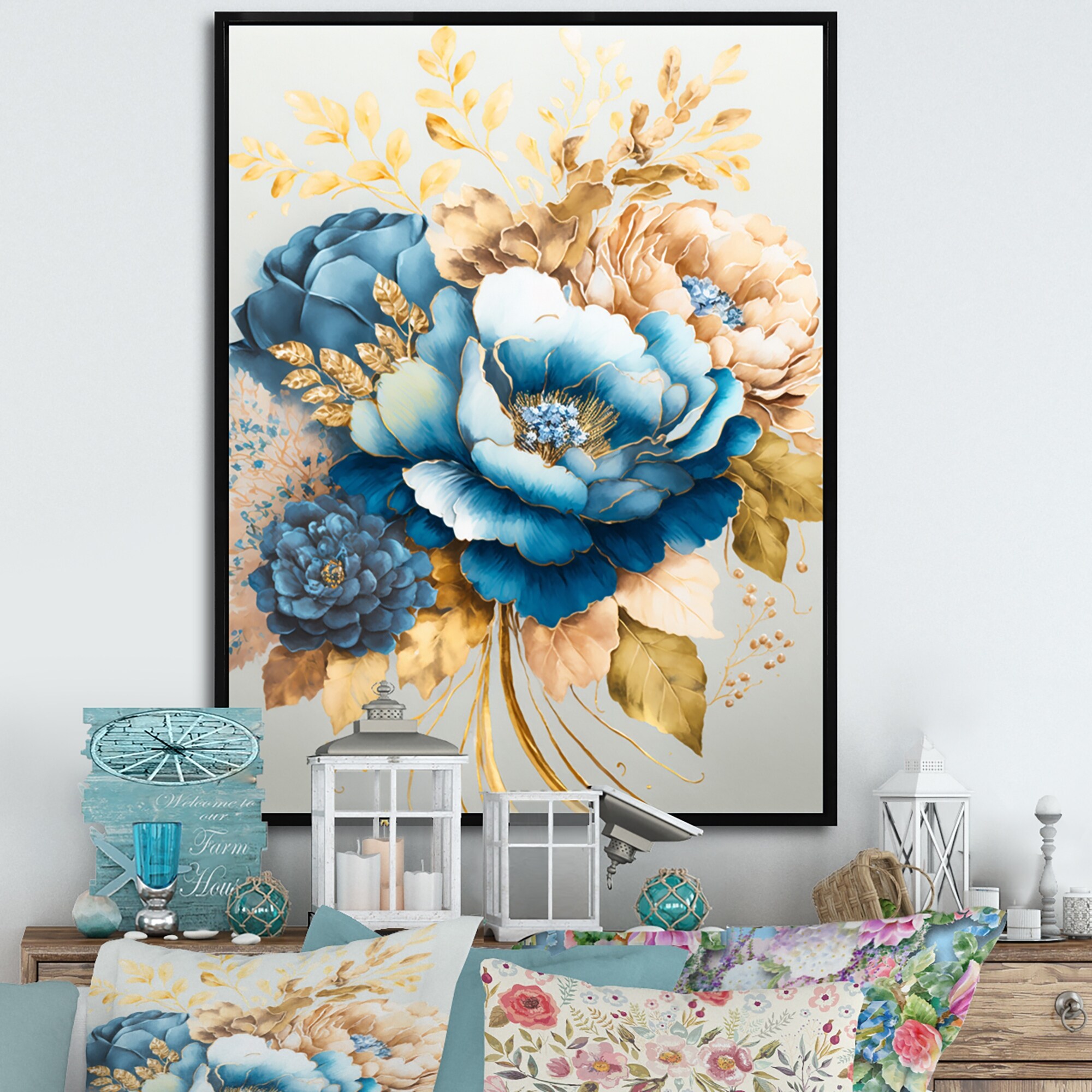 Designart "Golden Blue Flower Arrangement II" Floral & Botanical Framed Canvas Art Print