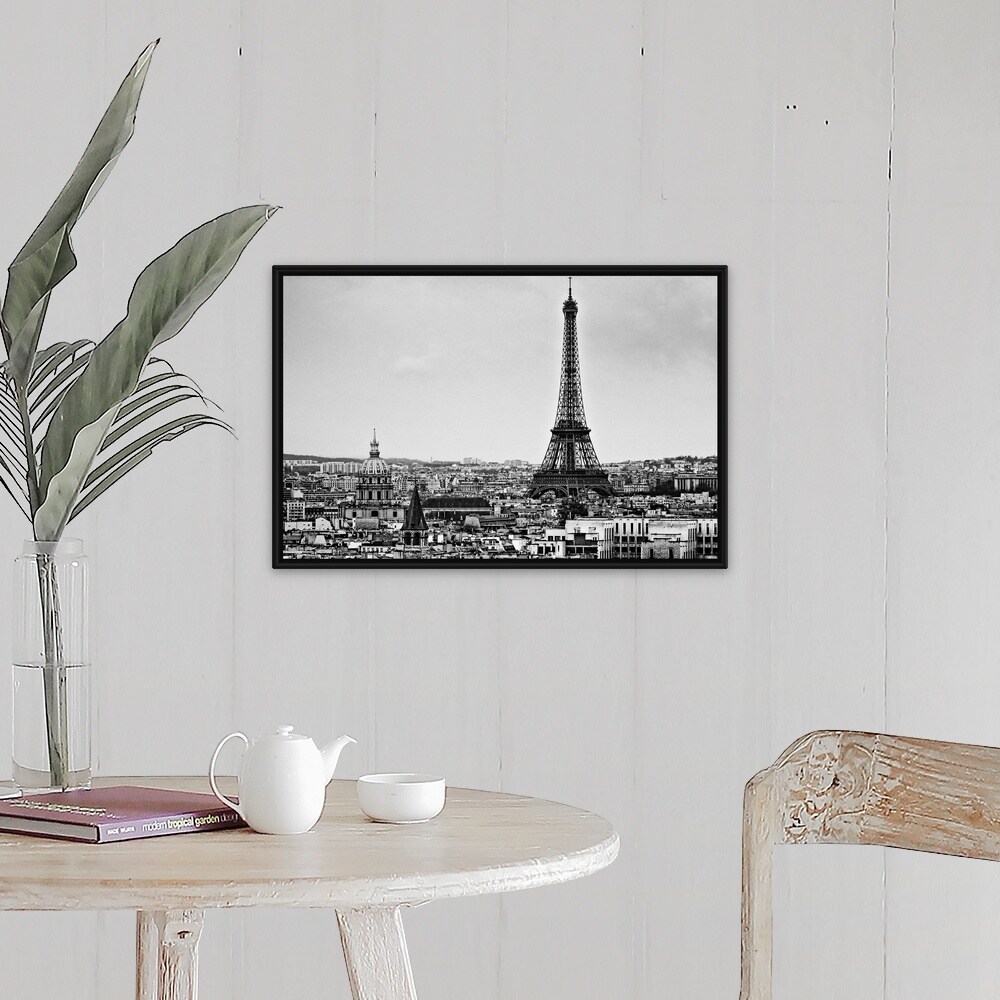 "View of city and Eiffel Tower, Paris, France." Black Float Frame Canvas Art