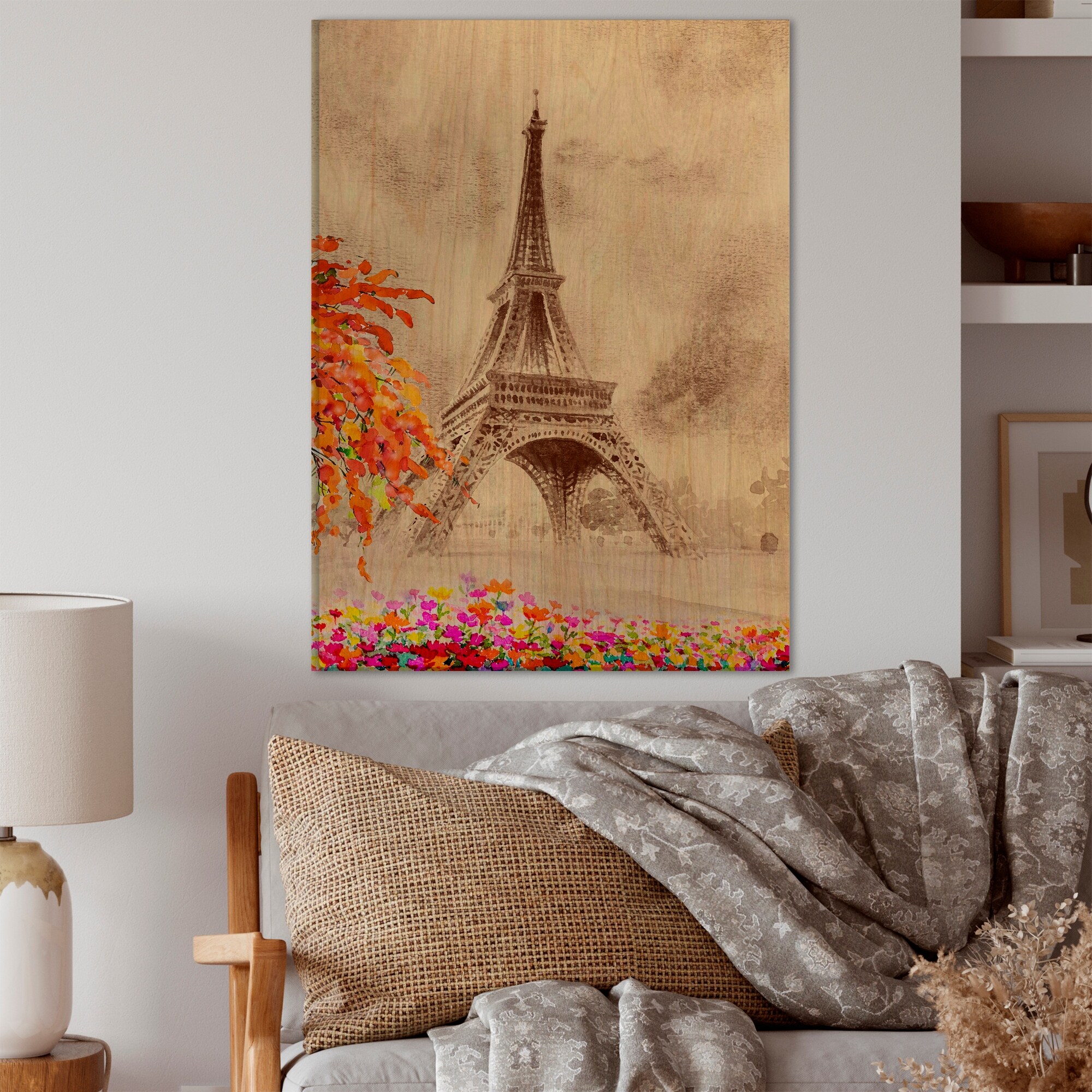 Designart 'Summer Paris France Eiffel Tower' Traditional Wood Wall Art Décor - Natural Pine Wood