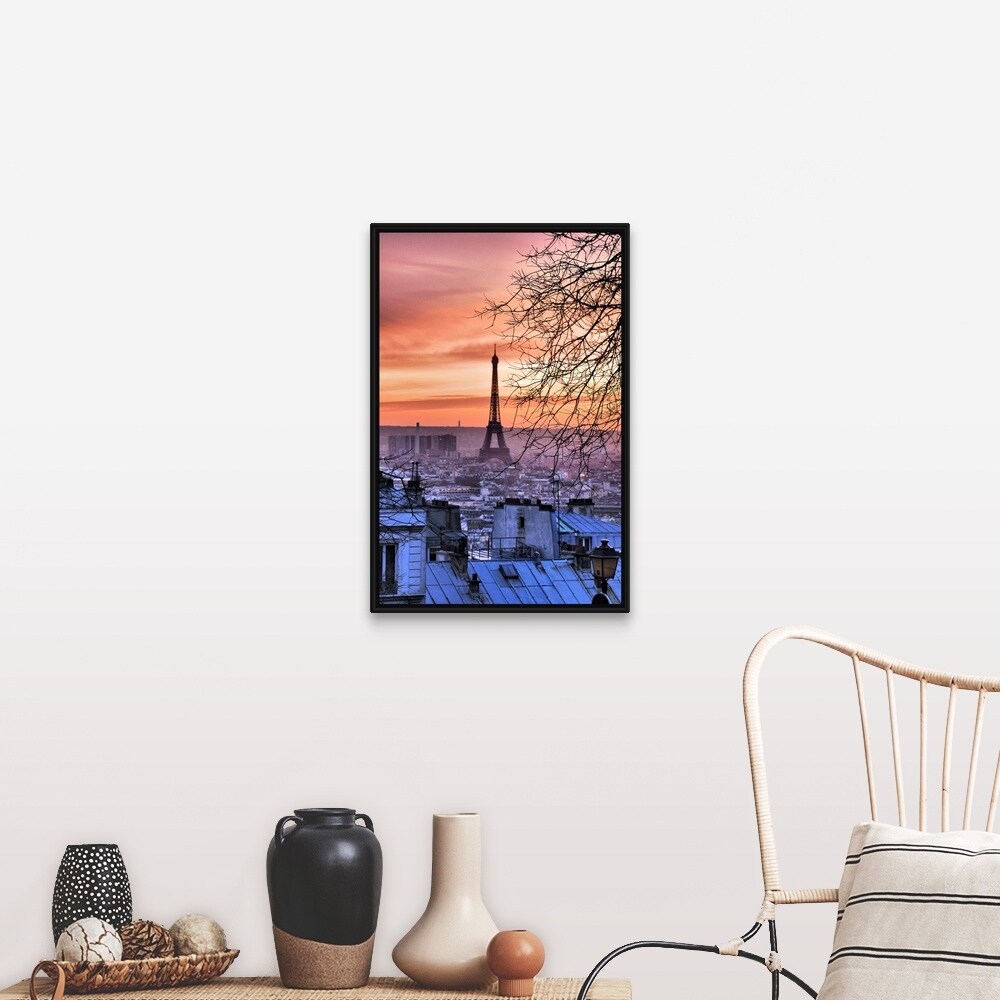 "View of Eiffel Tower and Paris roofs from Montmartre at sunset, Paris, France." Black Float Frame Canvas Art