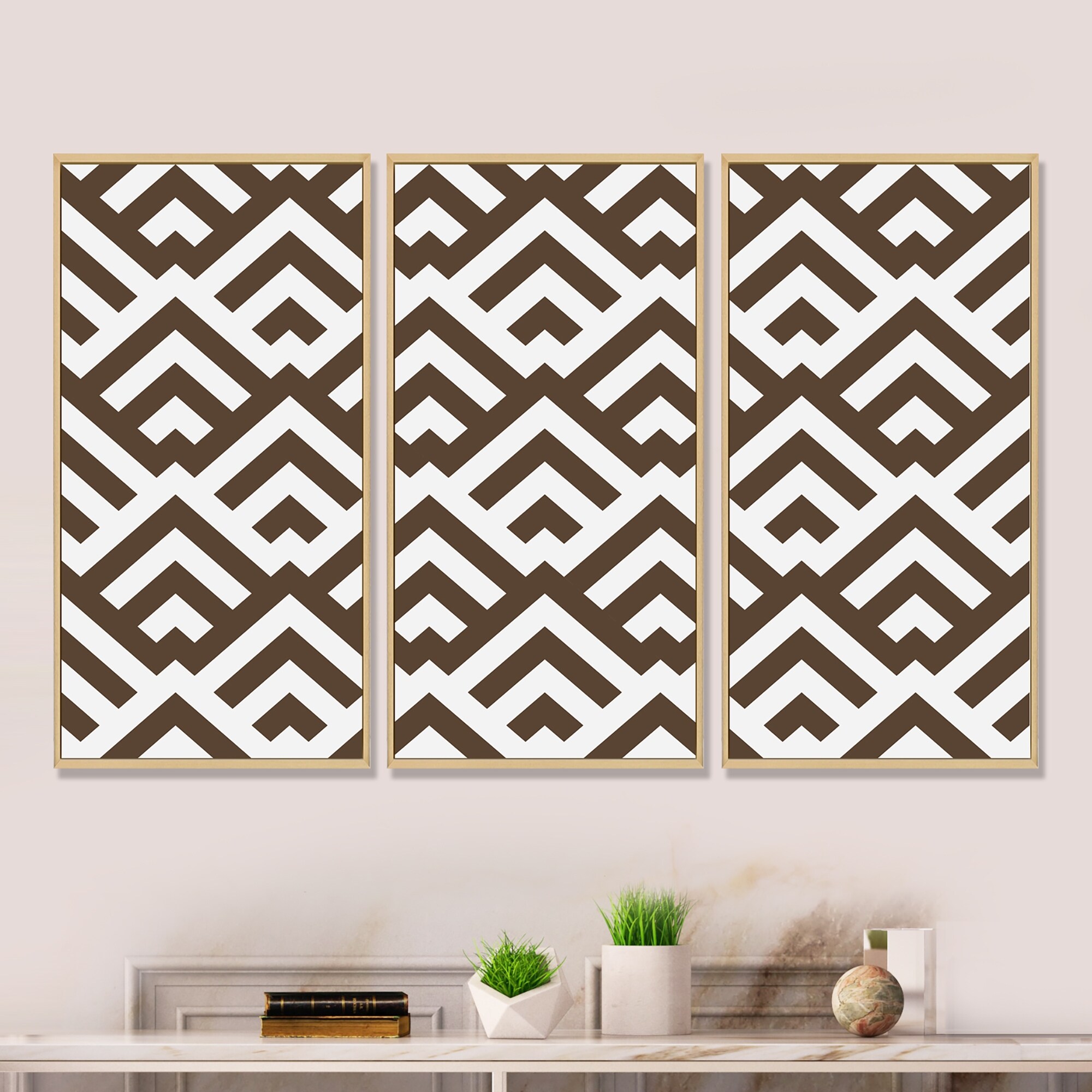 Designart "Dark Brown Triangular Geometrics" Modern Framed Art Set of 3 - 4 Colors of Frames