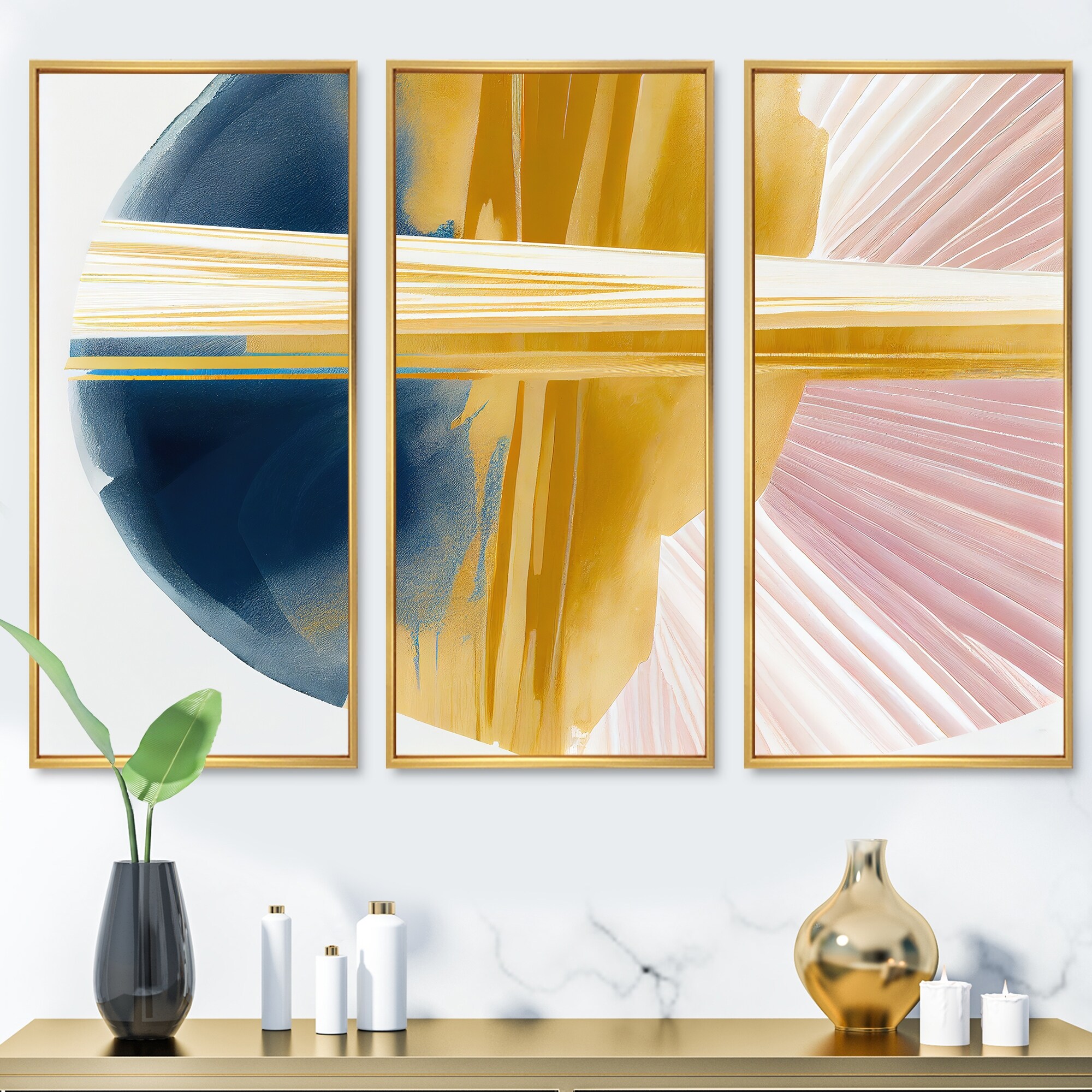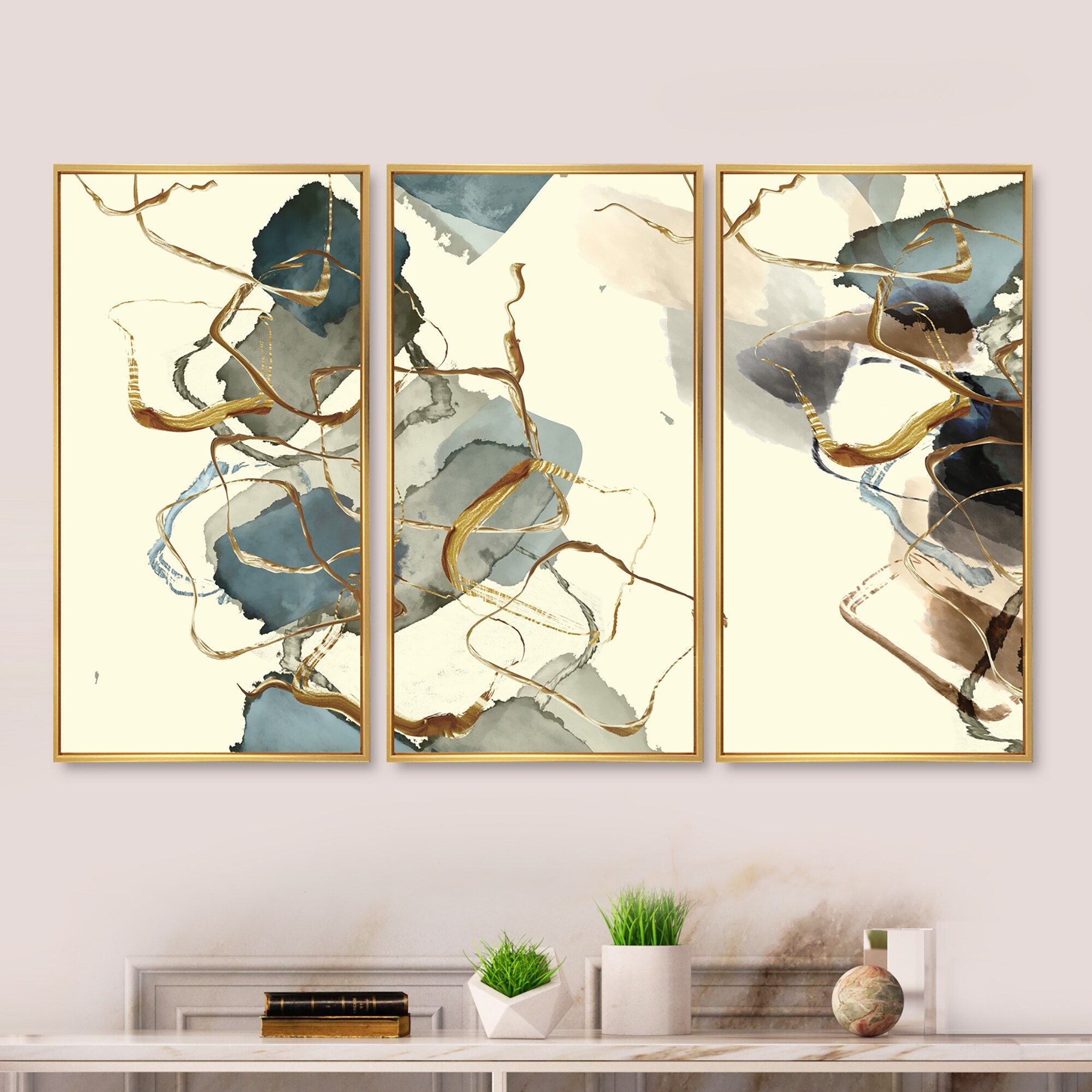 Designart "Wide Golden Brush Stroke II" Modern Spiral Framed Canvas Art Print - 3 Panels