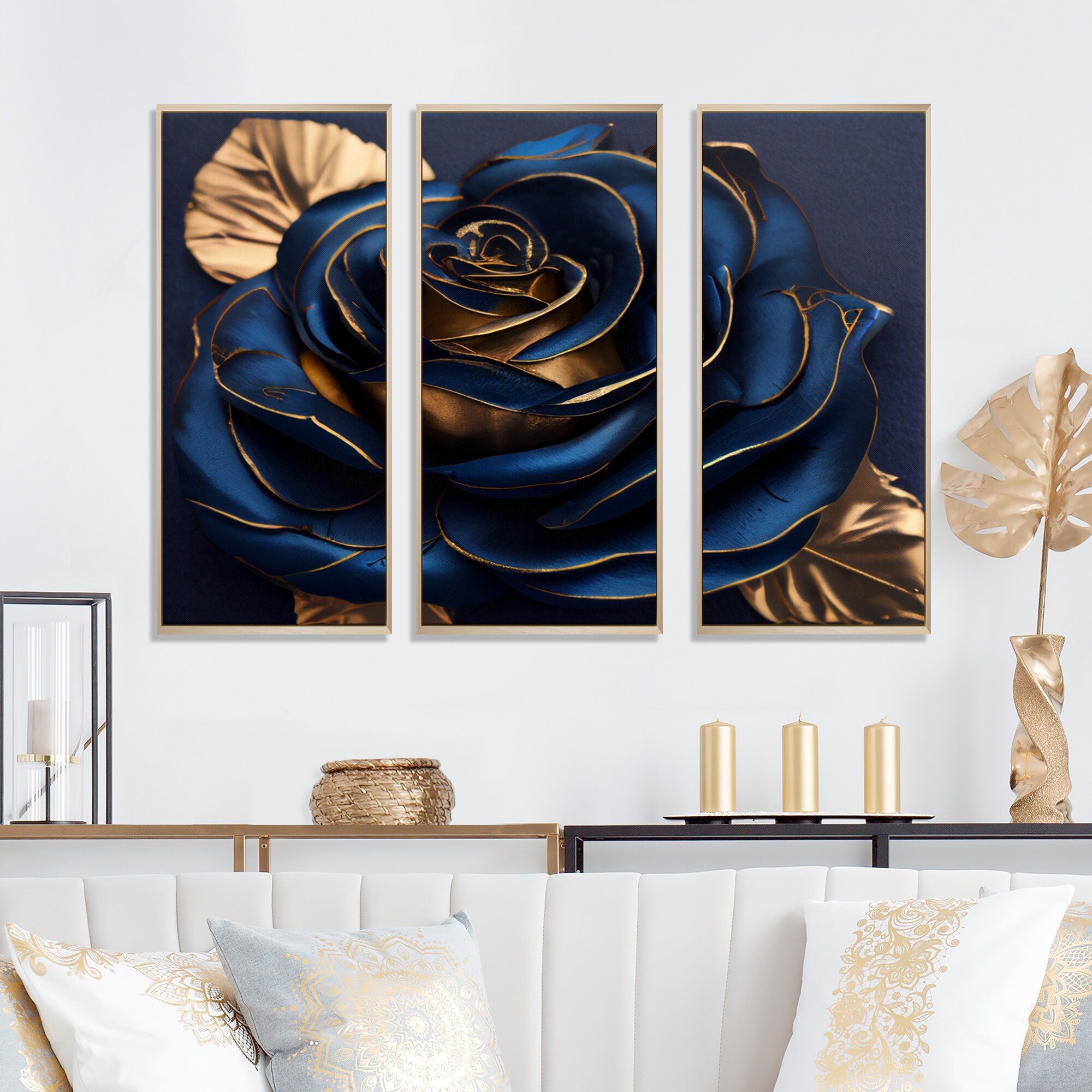 Designart "Gilded Rose in Kings Blue III" Floral Rose Framed Canvas Wall Art Print - 3 Panels