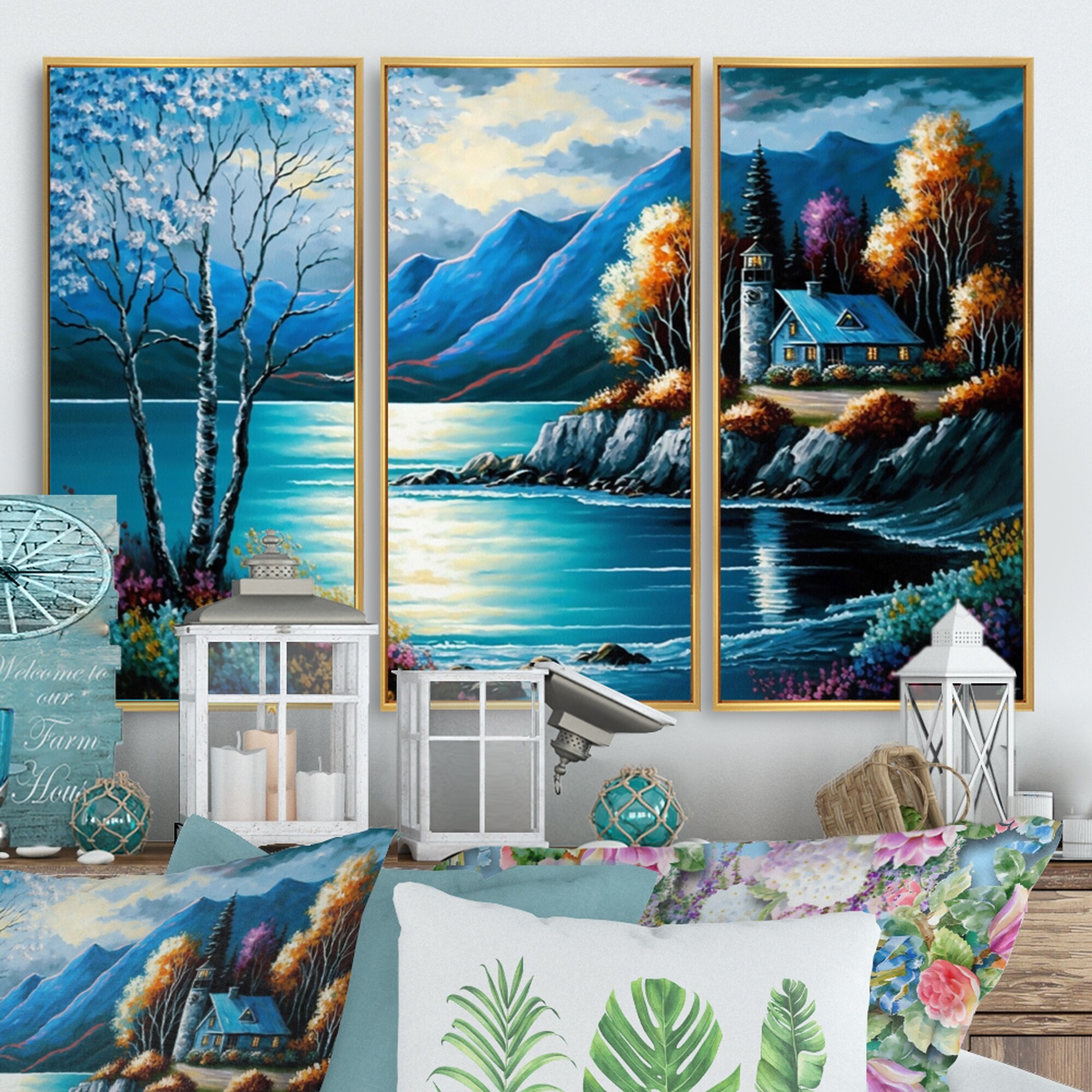 Designart "Lakehouse On the Coast in Summer III" Lake House Cottage Framed Canvas Art Print - 3 Panels