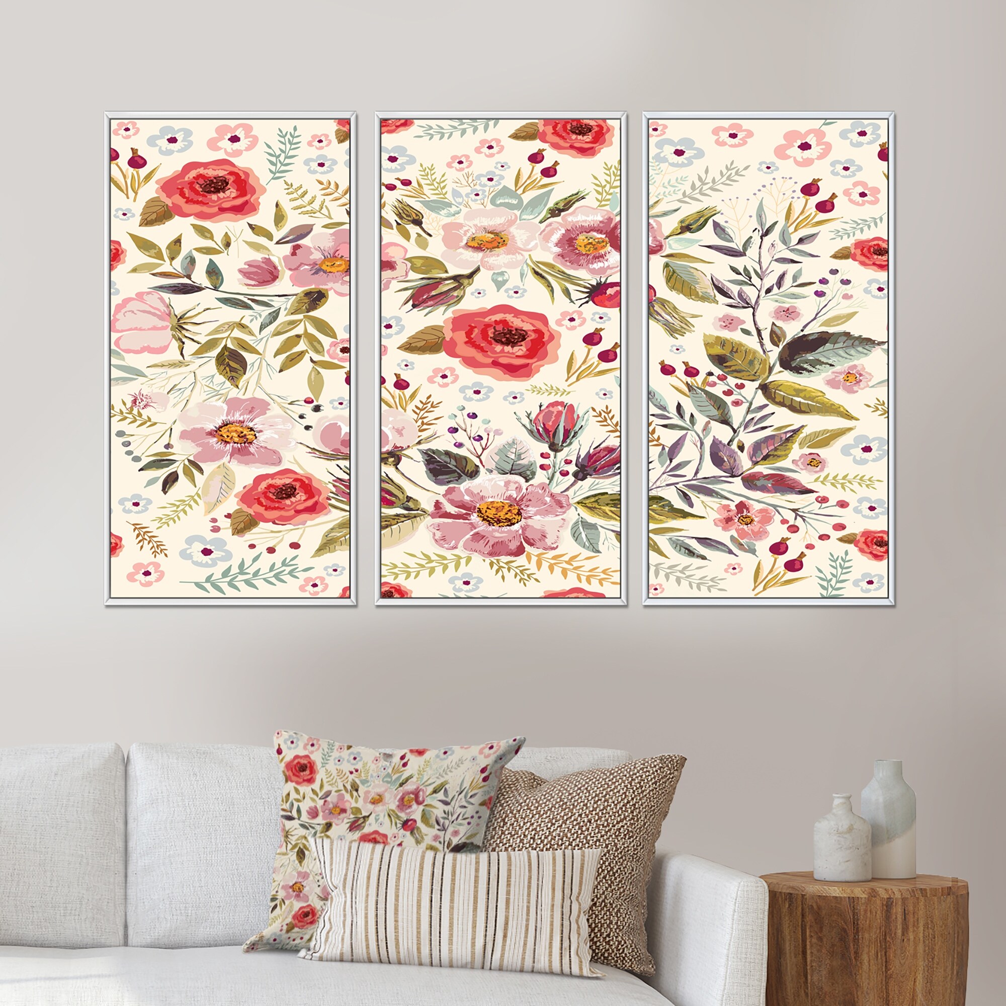 Designart "Hand drawn floral wreath" Floral Framed Canvas Wall Art Print Set of 3 - 4 Colors of Frames