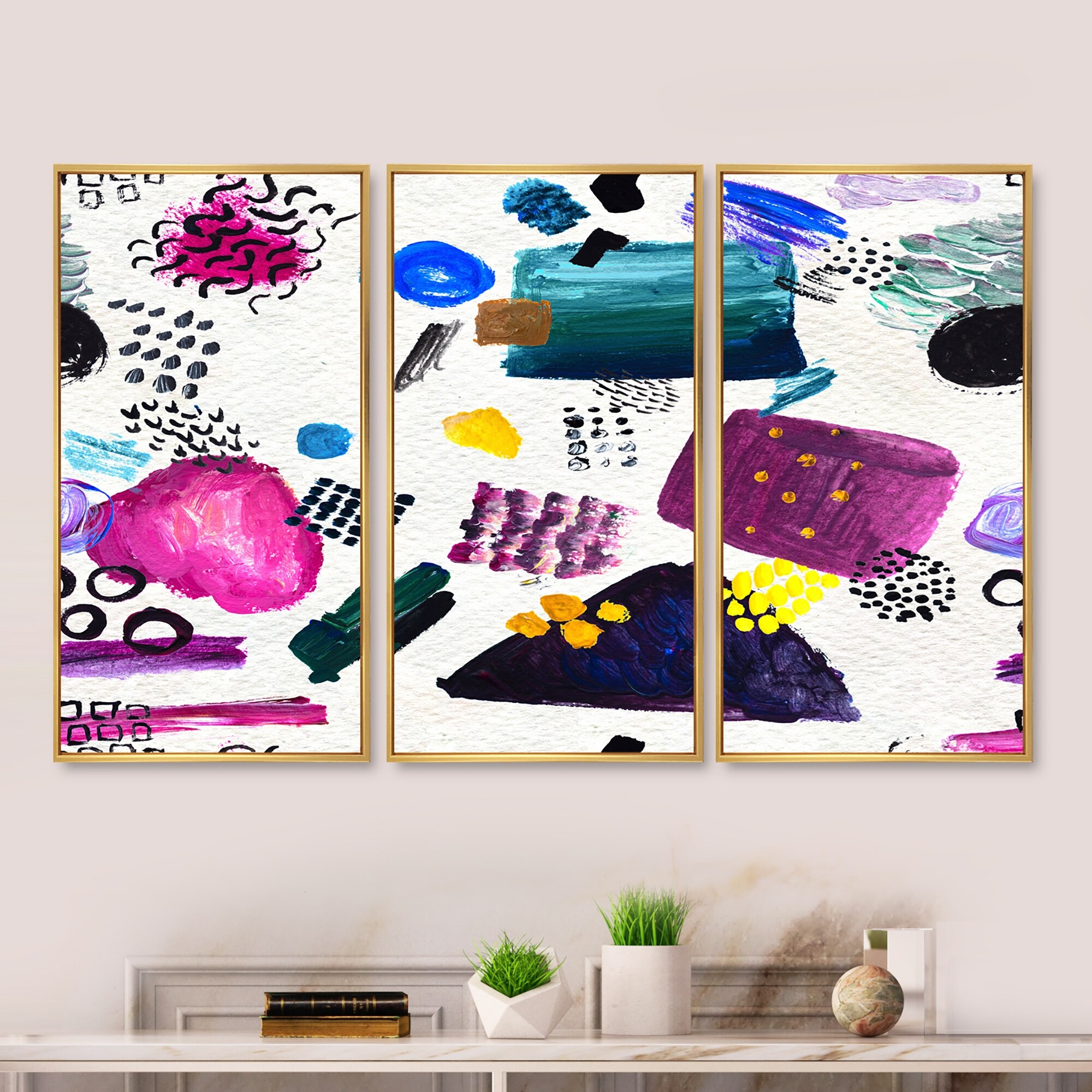 Designart "Retro Geometrical Polka Dot Elements" Modern Framed Art Set of 3 - 4 Colors of Frames
