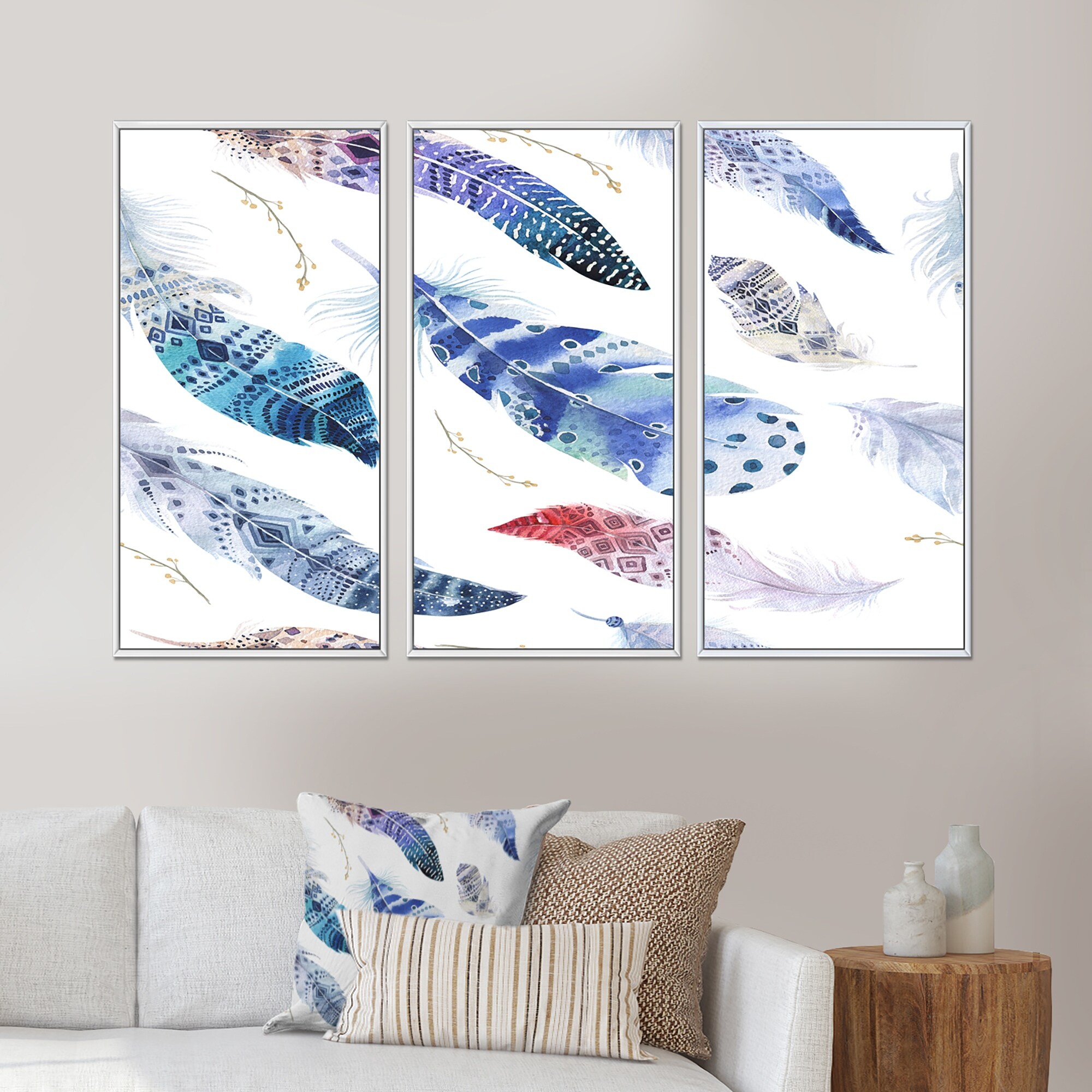 Designart "Twirling Colorful Boho Feathers III" Bohemian Framed Art Prints Set of 3 - 4 Colors of Frames