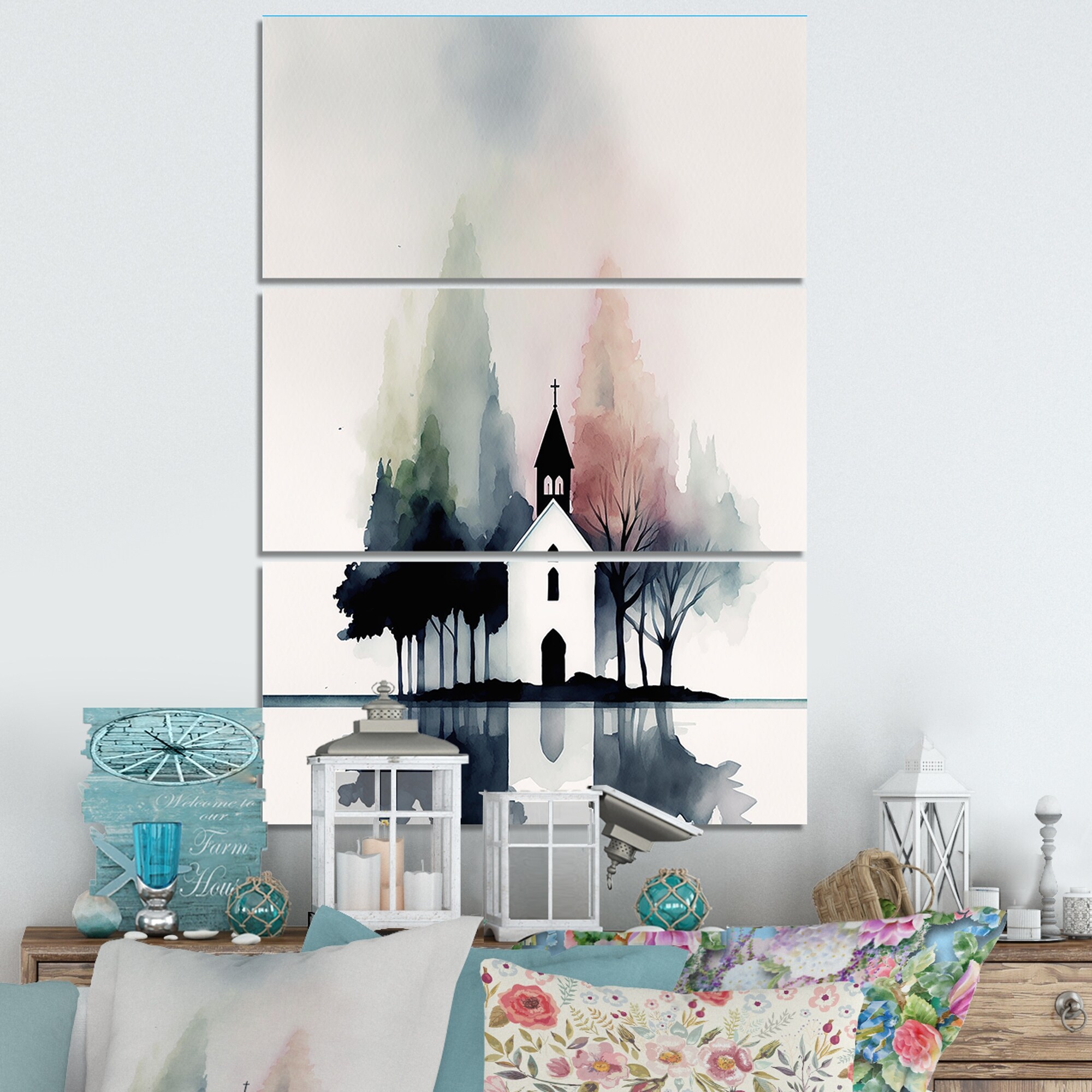 Designart "Picturesque Church in the Countryside" Lake House Cottage Canvas Art Print - 3 Panels