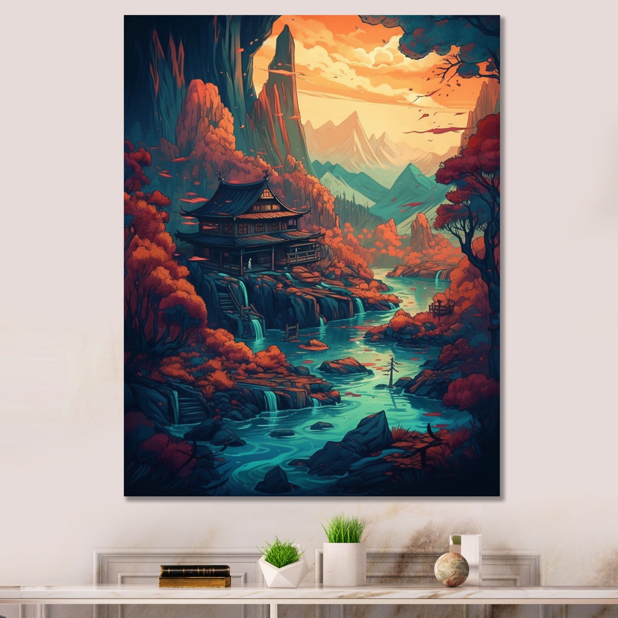 Designart "Mountain Top Asian Inspired Home I" Japon Landscape Wall Art for Living Room