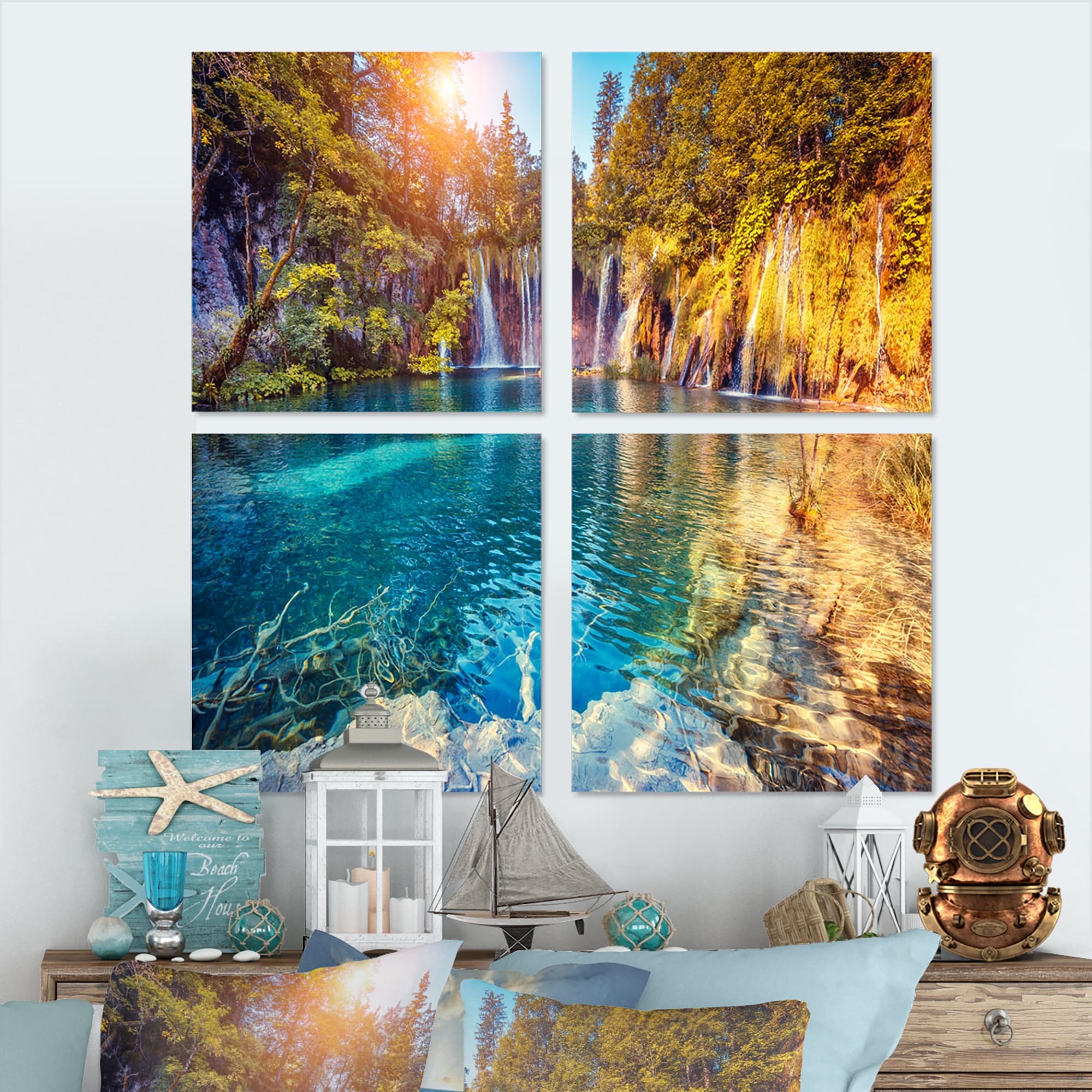 Designart "Turquoise Water and Sunny Beams" Landscape Framed Wall Decor Set of 3 - 4 Colors of Frames
