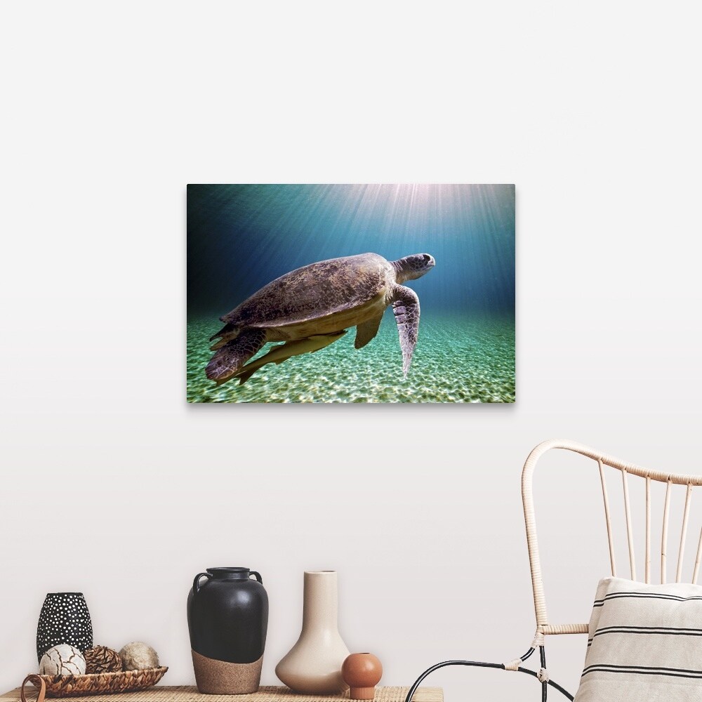"Sun beams filtering through sea with green sea turtle." Canvas Wall Art