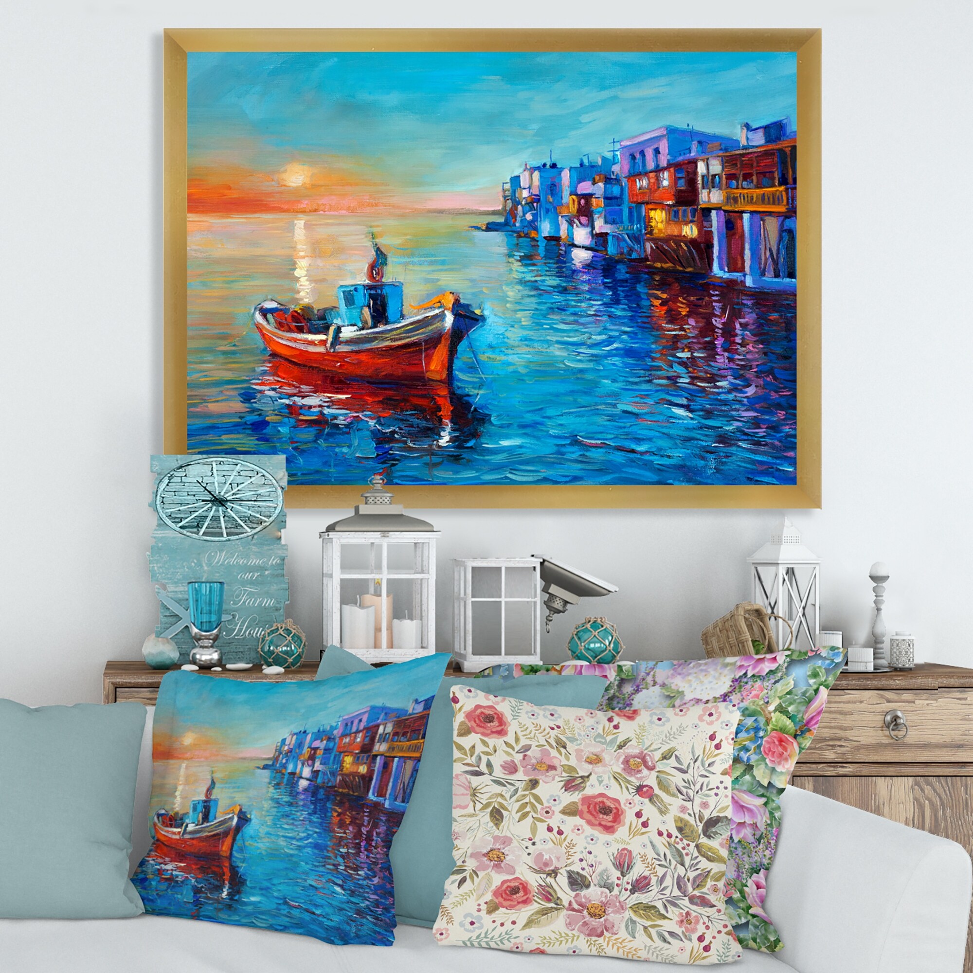 Designart "Sunrise Boat II" Nautical & Coastal Framed Canvas - Blue