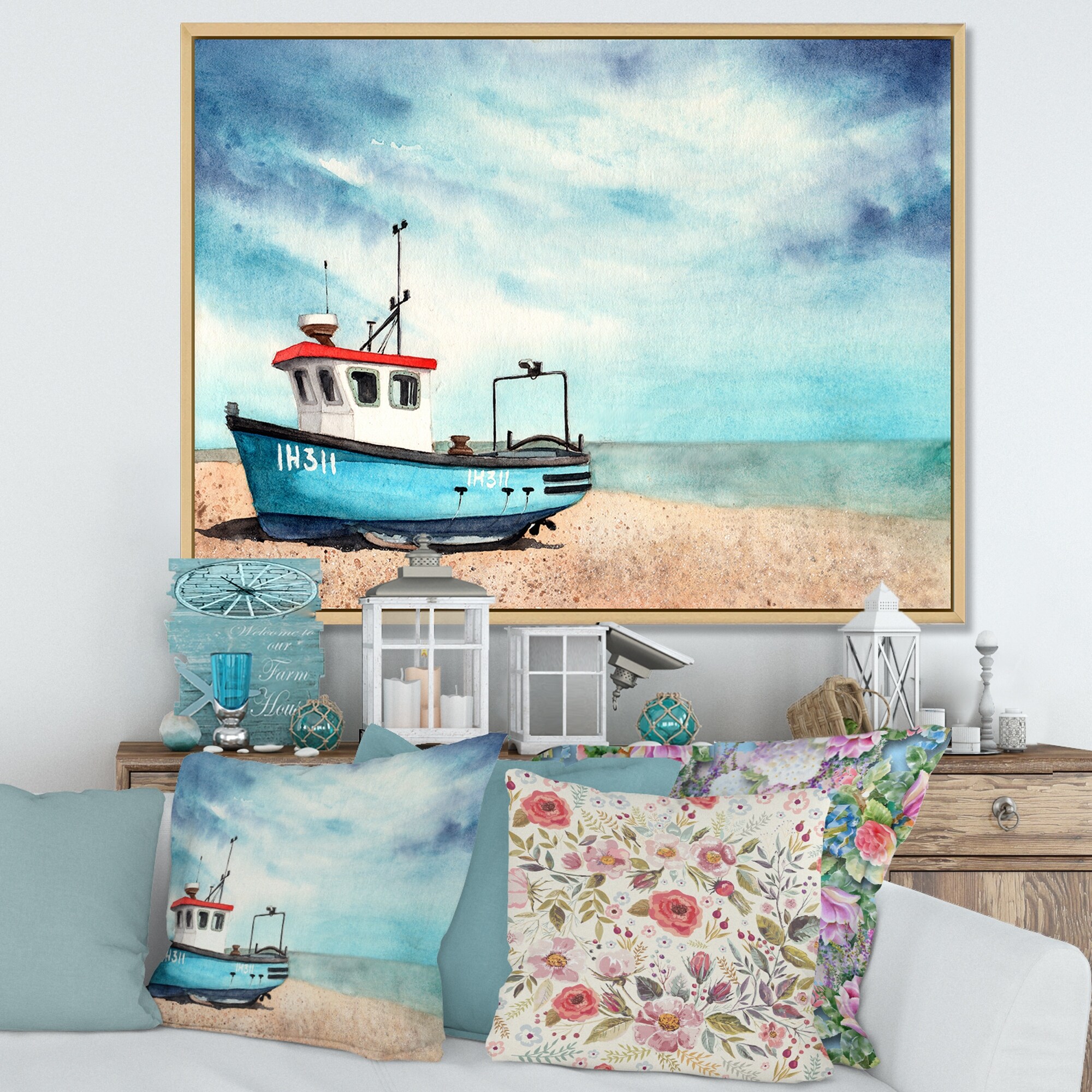Designart "An Old Blue Boat on A Sandy Beach With Blue Skies" Nautical & Coastal Framed Canvas Wall Art Print