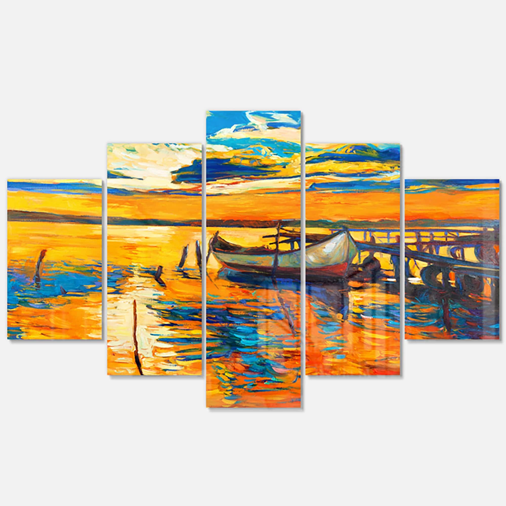 Designart 'Boat and Jetty at Sunset' Landscape Metal Wall Art