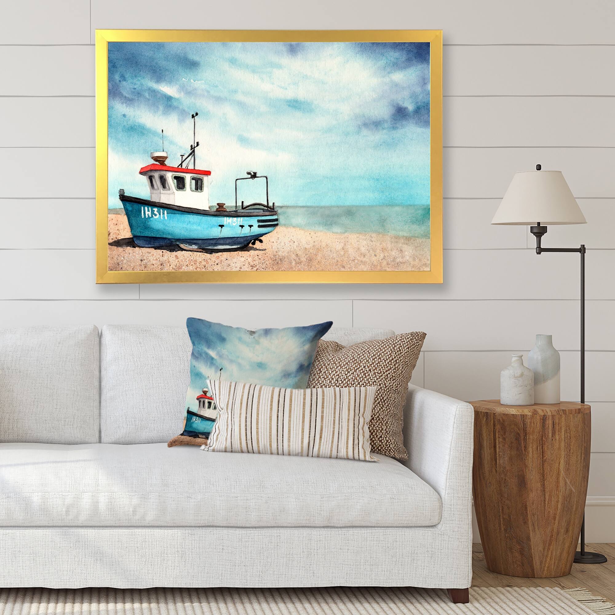 Designart "An Old Blue Boat on A Sandy Beach With Blue Skies" Nautical & Coastal Framed Art Print