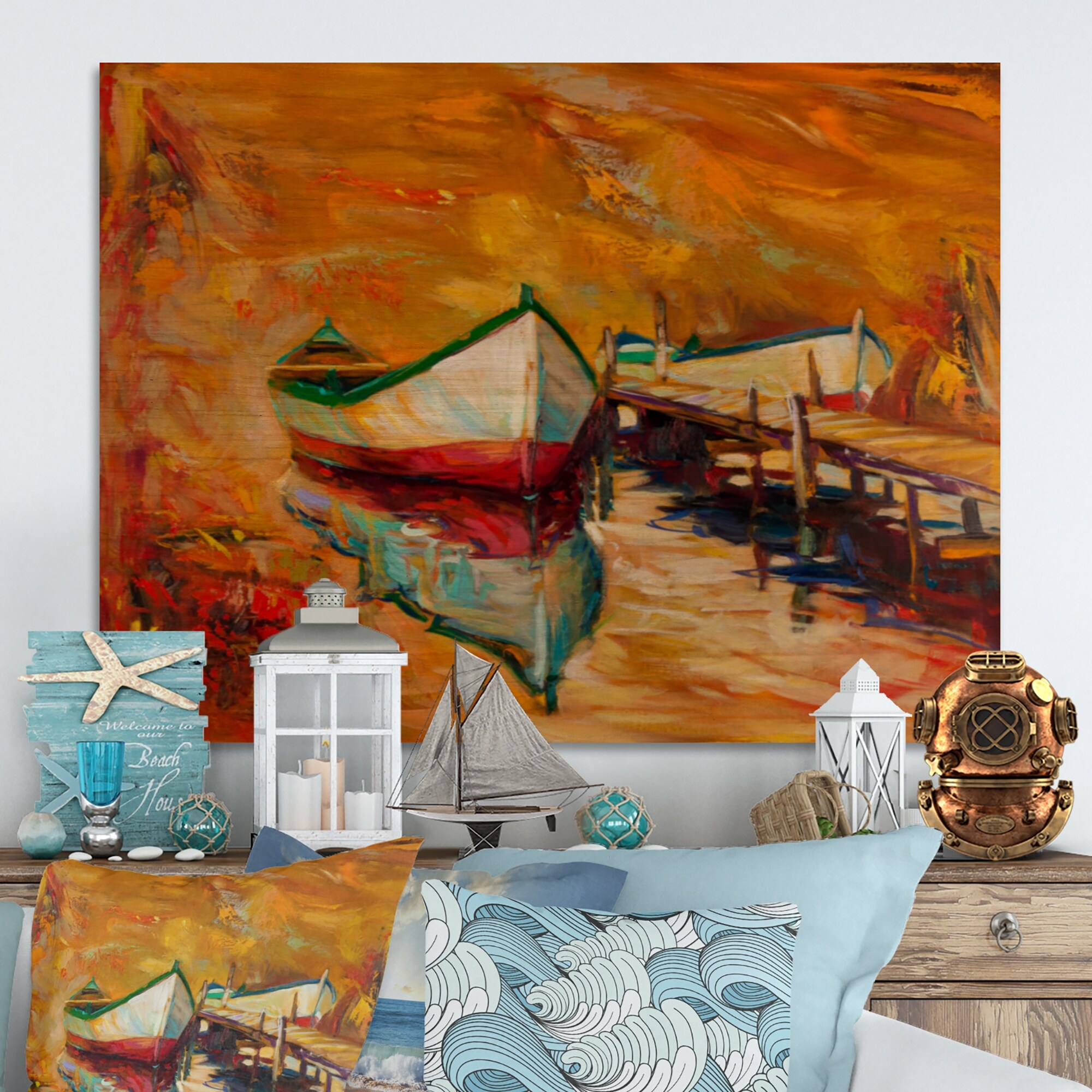 Designart 'Boats At Pier in Golden Sunset' Nautical & Coastal Wood Wall Art Décor - Natural Pine Wood