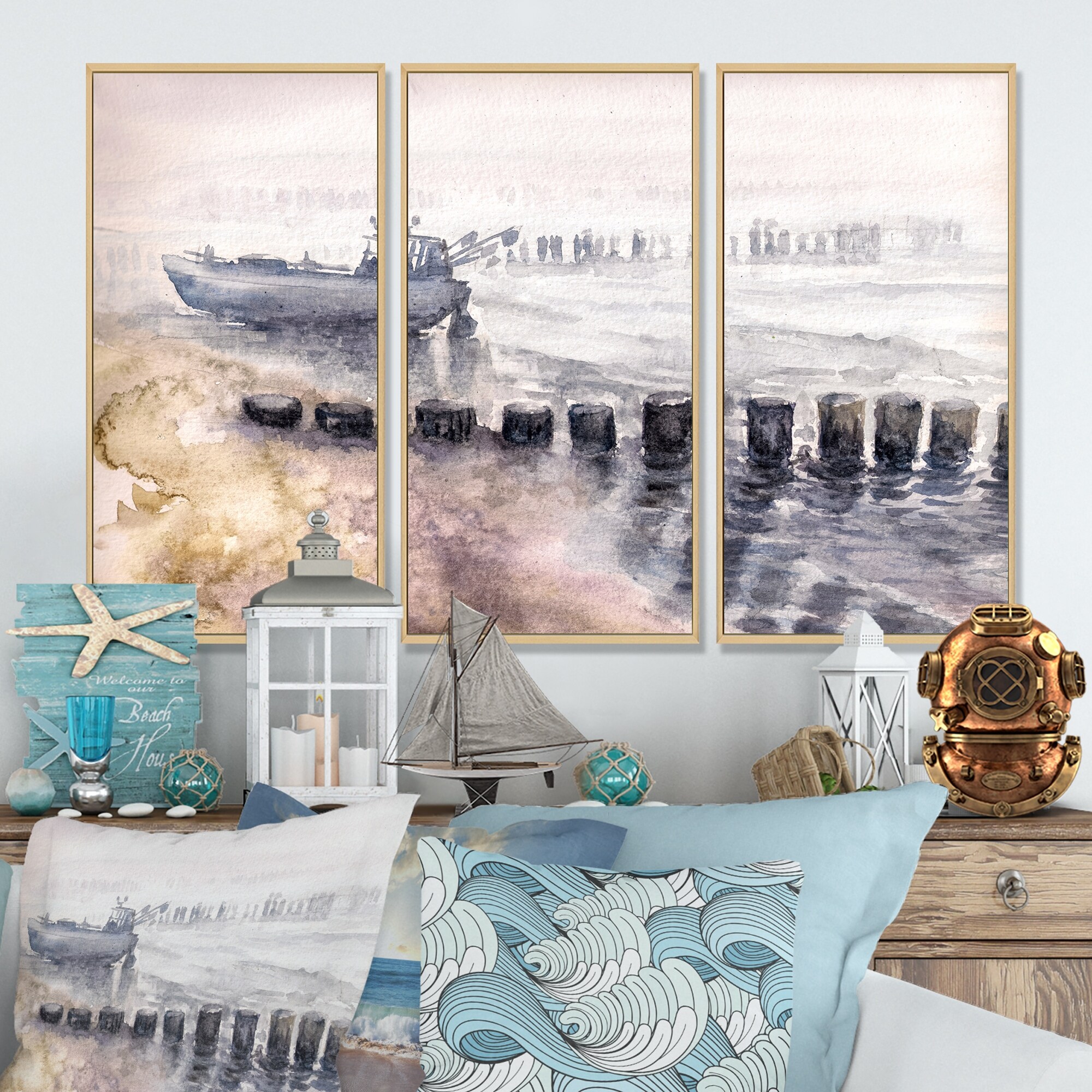 Designart "Fishing Boat in the Harbor" Nautical & Coastal Framed Canvas Wall Art Print Set of 3 - 4 Colors of Frames