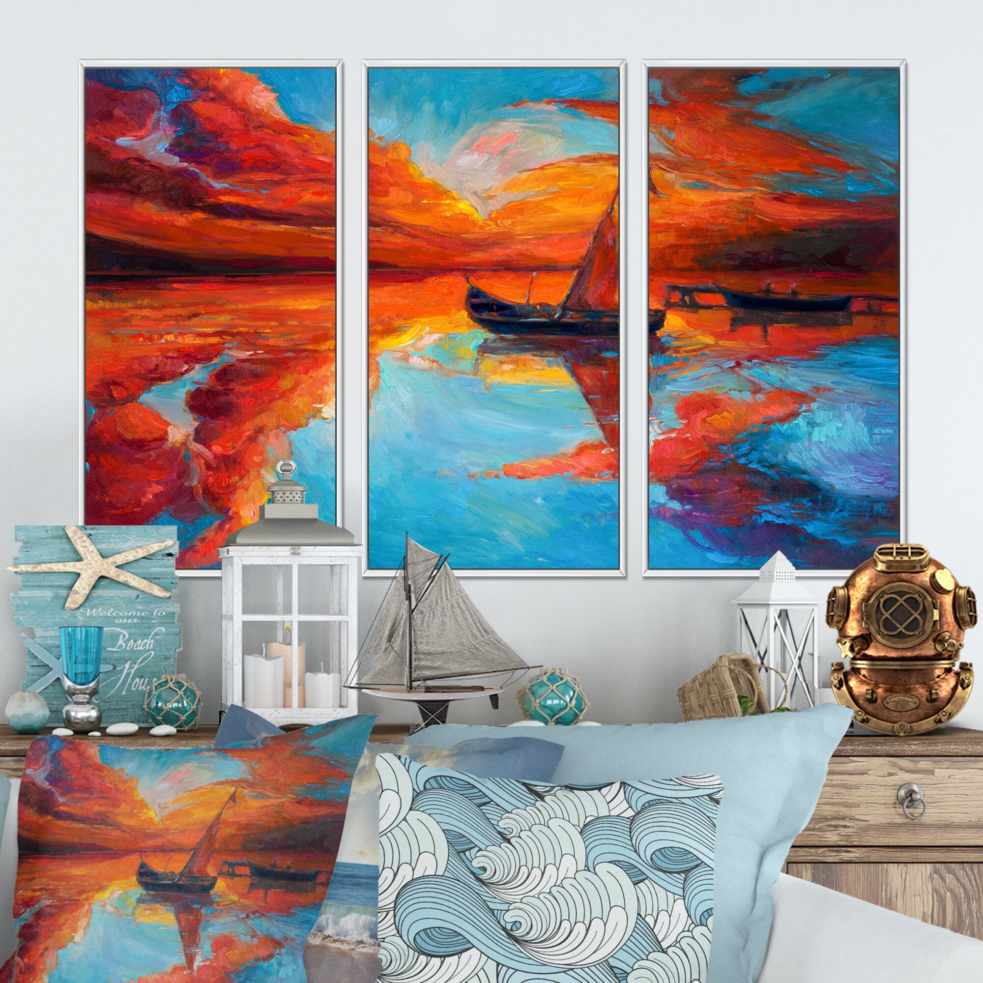 Designart "Sailboat During Exotic Sunset IV" Coastal Boat Framed Canvas Wall Art Print - 3 Panels
