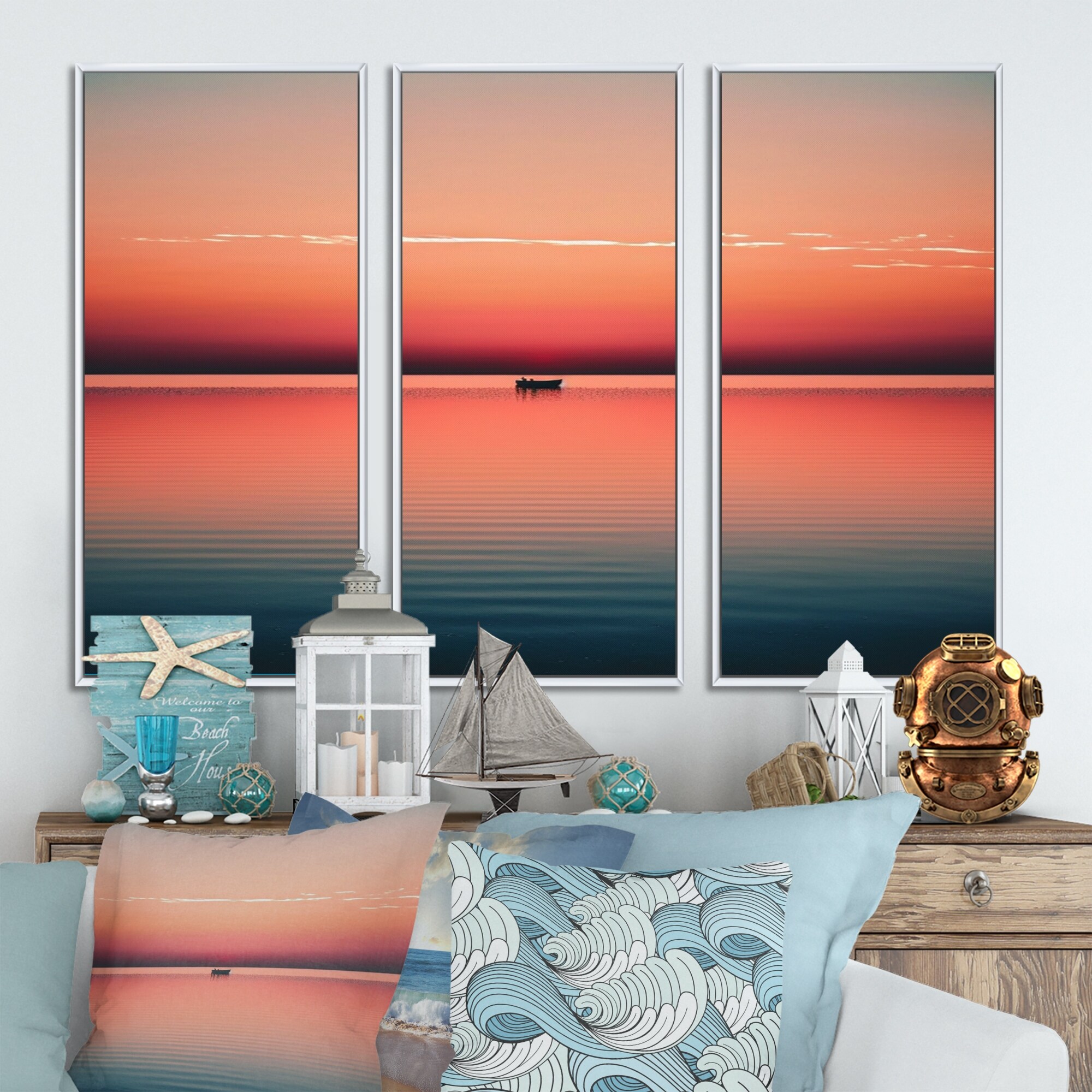 Designart "Little Boat During Warm Deep Red Sunset" Nautical & Coastal Framed Art Set of 3 - 4 Colors of Frames