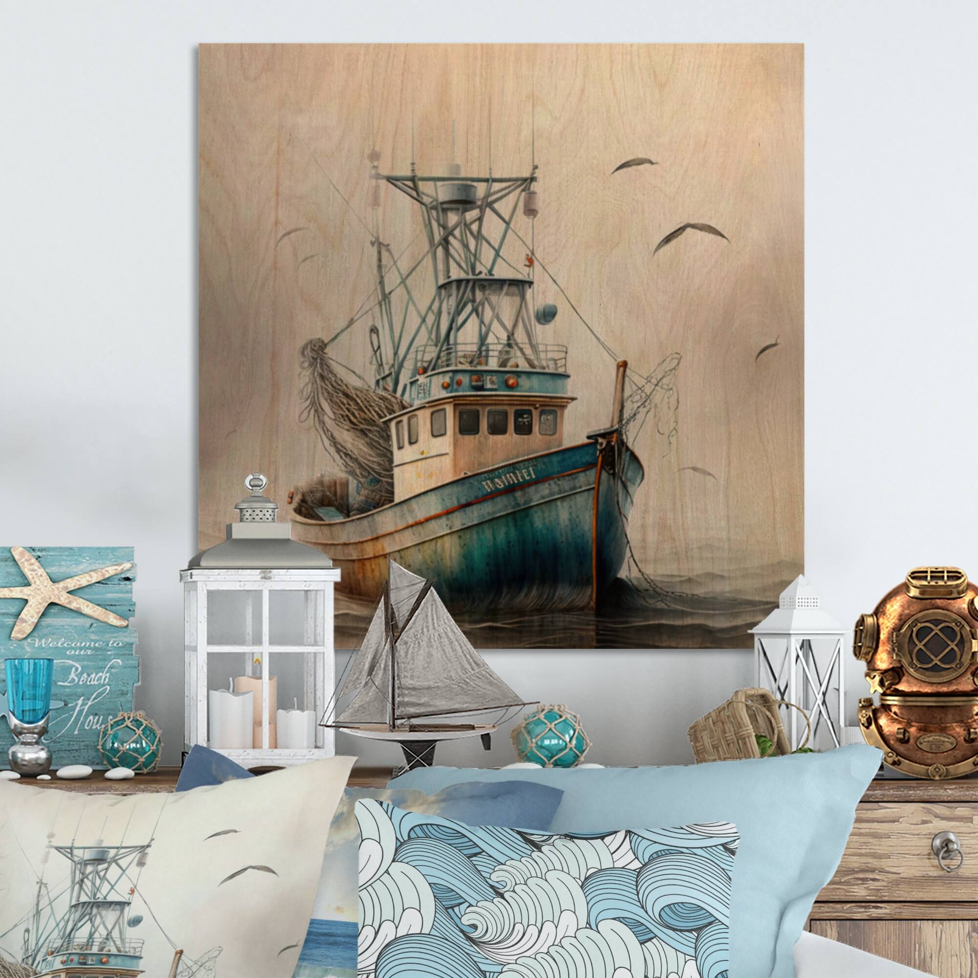 Designart 'Fisherman'S Boat on the Ocean II' Coastal Boat Wood Wall Art - Natural Pine Wood