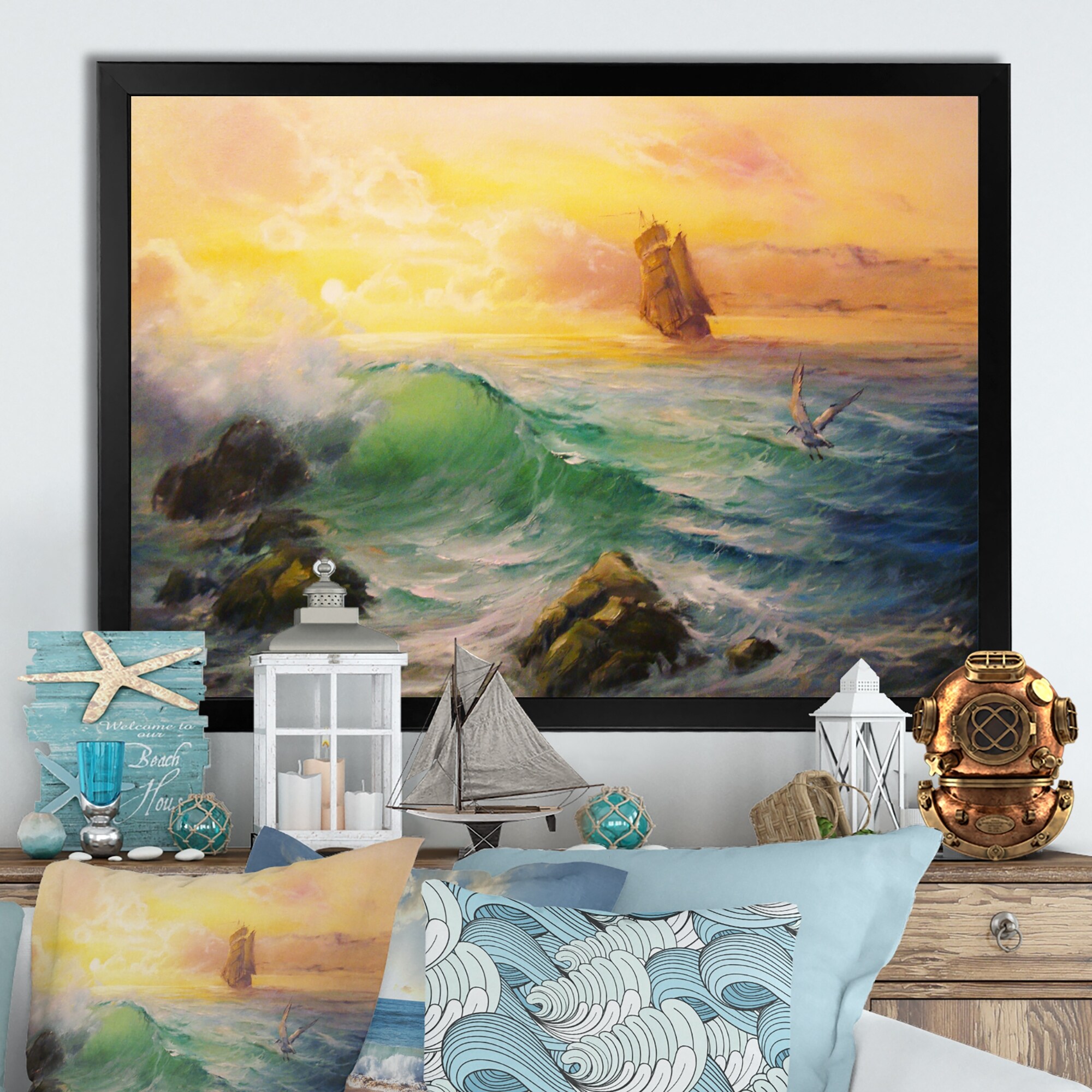Designart "Sunset On Colonial Boat" Nautical & Coastal Framed Wall Decor