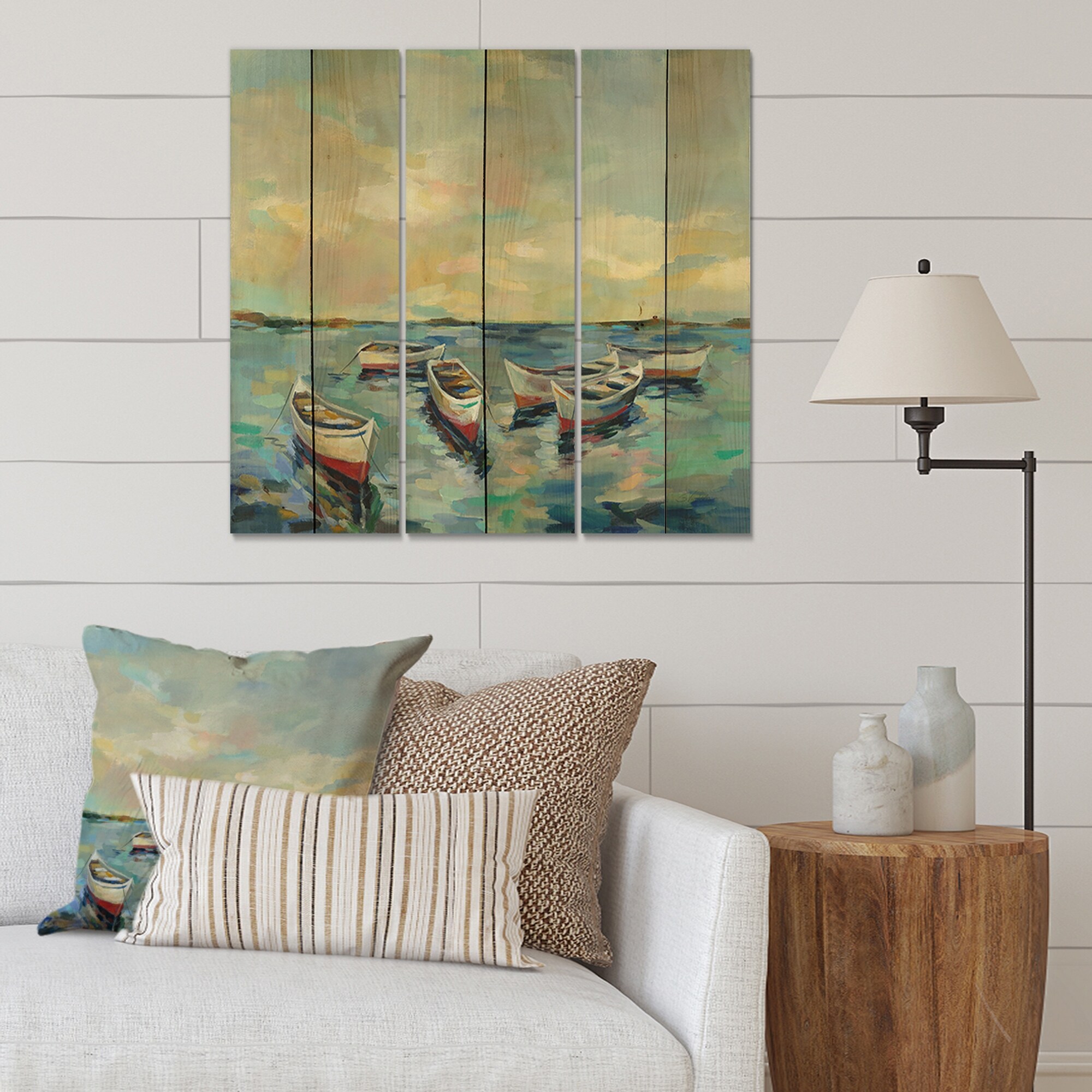 Designart 'Coastal View of Boats' Cottage Print on Natural Pine Wood - 3 Panels