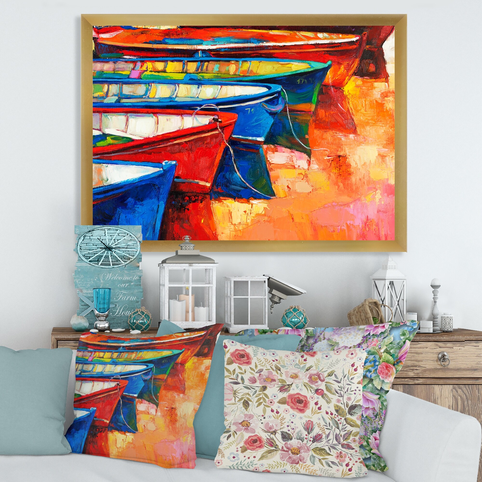 Designart "Boats Resting on the Water Near Coastal Town IV" Nautical & Coastal Framed Canvas Wall Art Print