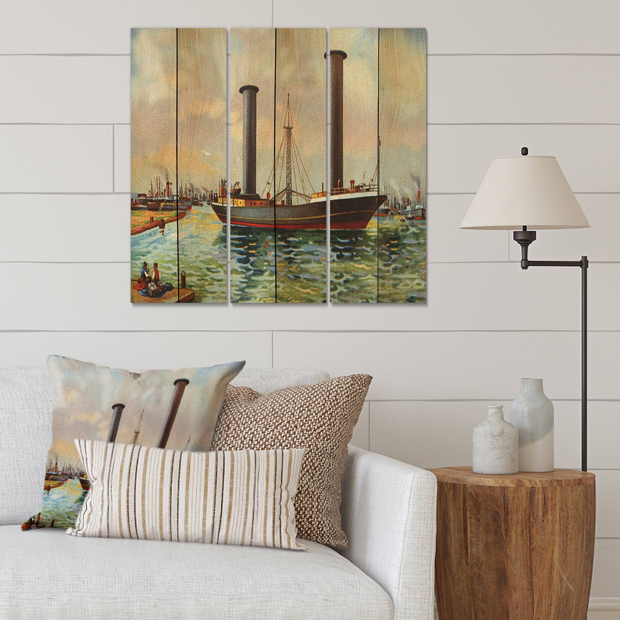 Designart 'Ancient Boat Leaving the Harbor' Nautical & Coastal Print on Natural Pine Wood - 3 Panels
