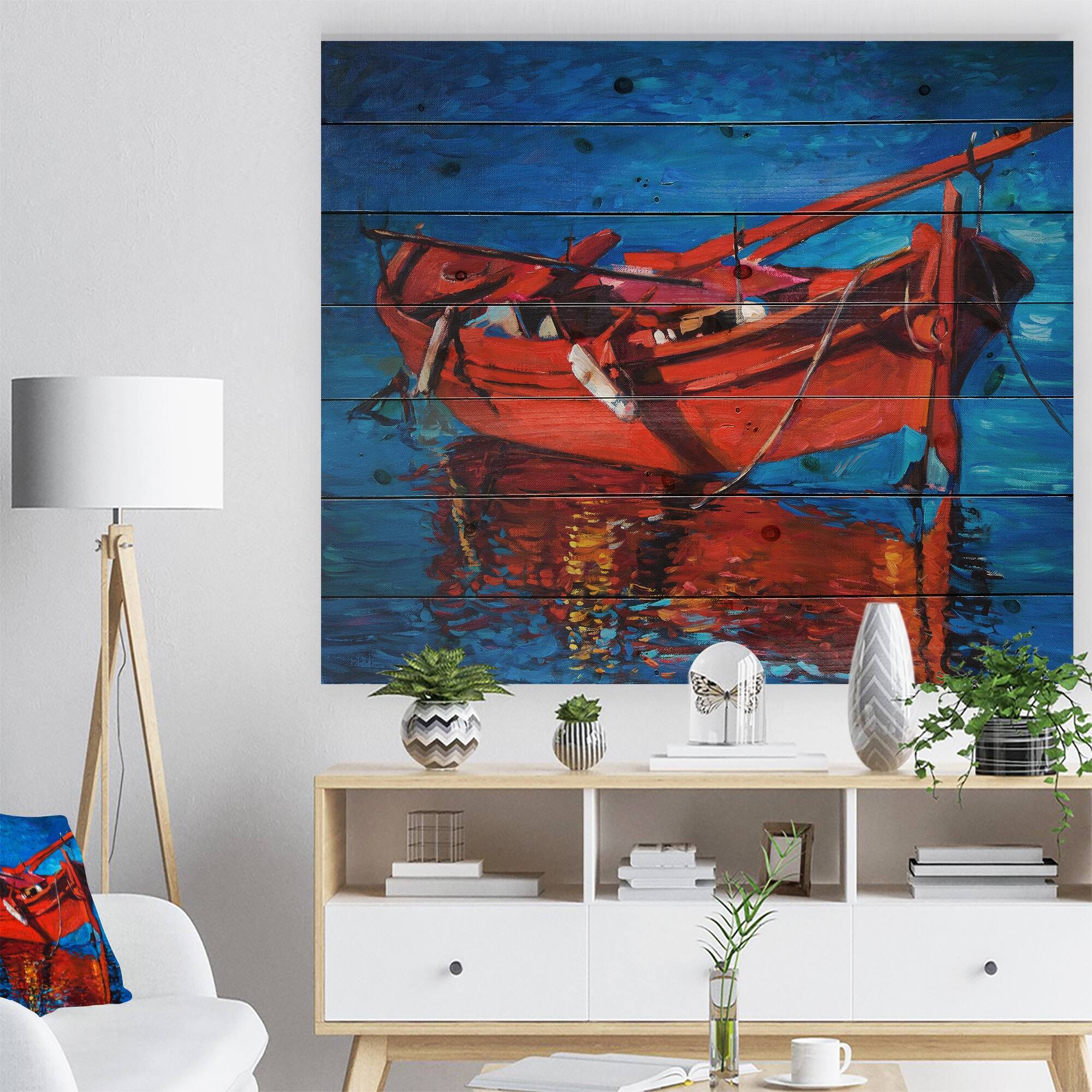 Designart 'Red Boat over the ocean' Sea & Shore Print on Natural Pine Wood - Blue