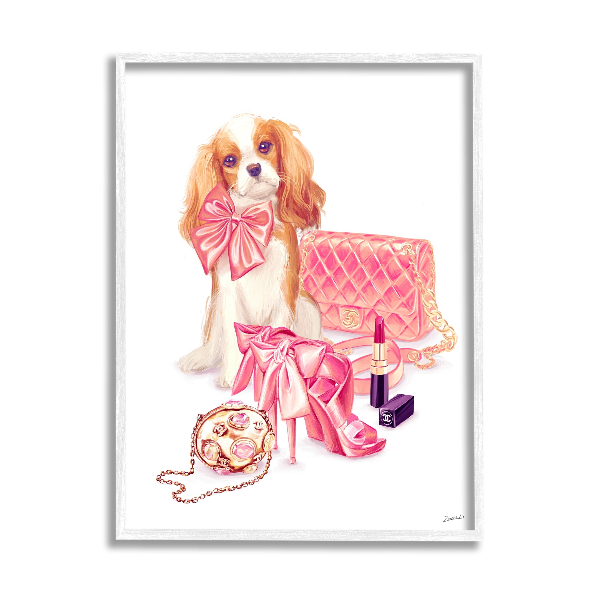 Stupell Industries Upscale Dog Pink Bow Fashion Accessories Makeup Framed Wall Art