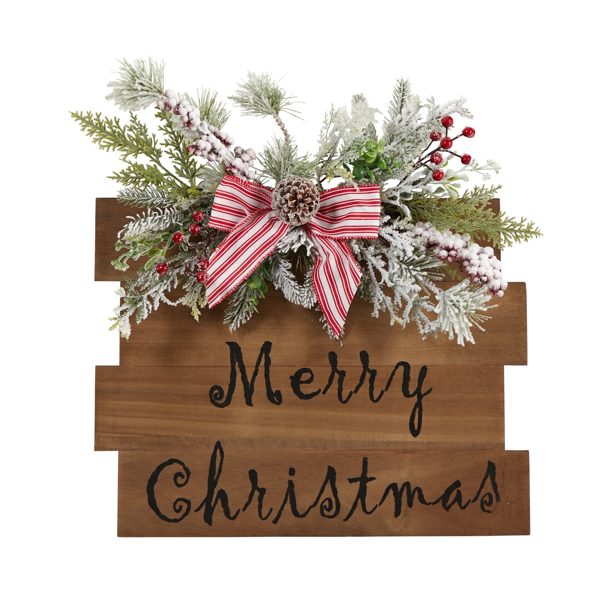20" Holiday Merry Christmas Door Wall Hanger with Pine and Berries Stripped Bow Wall Art Décor