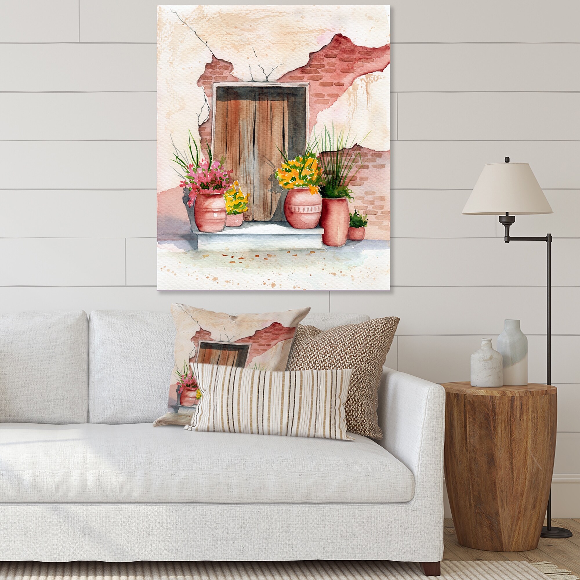Designart "Old Wooden Door Brick Wall And Some Plants I" Vintage Canvas Wall Art Print