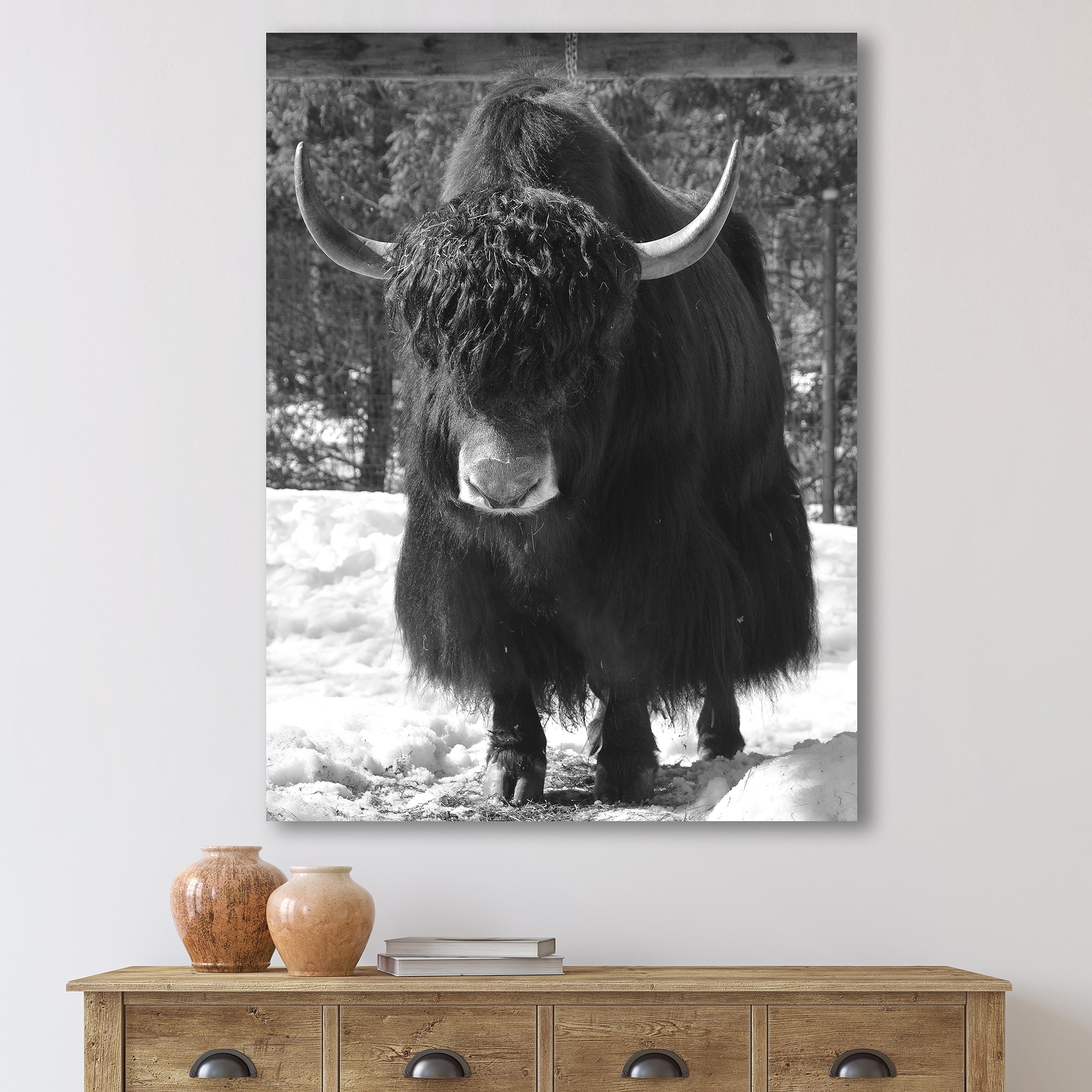Designart "Portrait of Wild Bull in Winter Forest II" Farmhouse Framed Canvas Wall Art Print