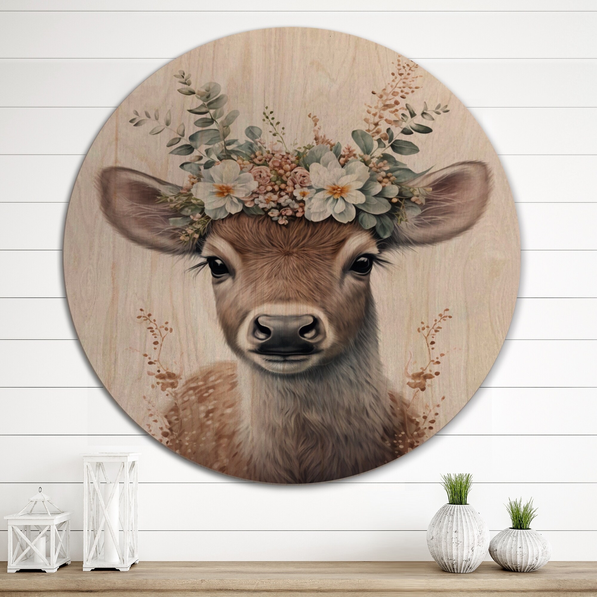 Designart "Cute Baby Bull With Floral Crown " Modern Wood Wall Art Décor - Natural Pine Wood