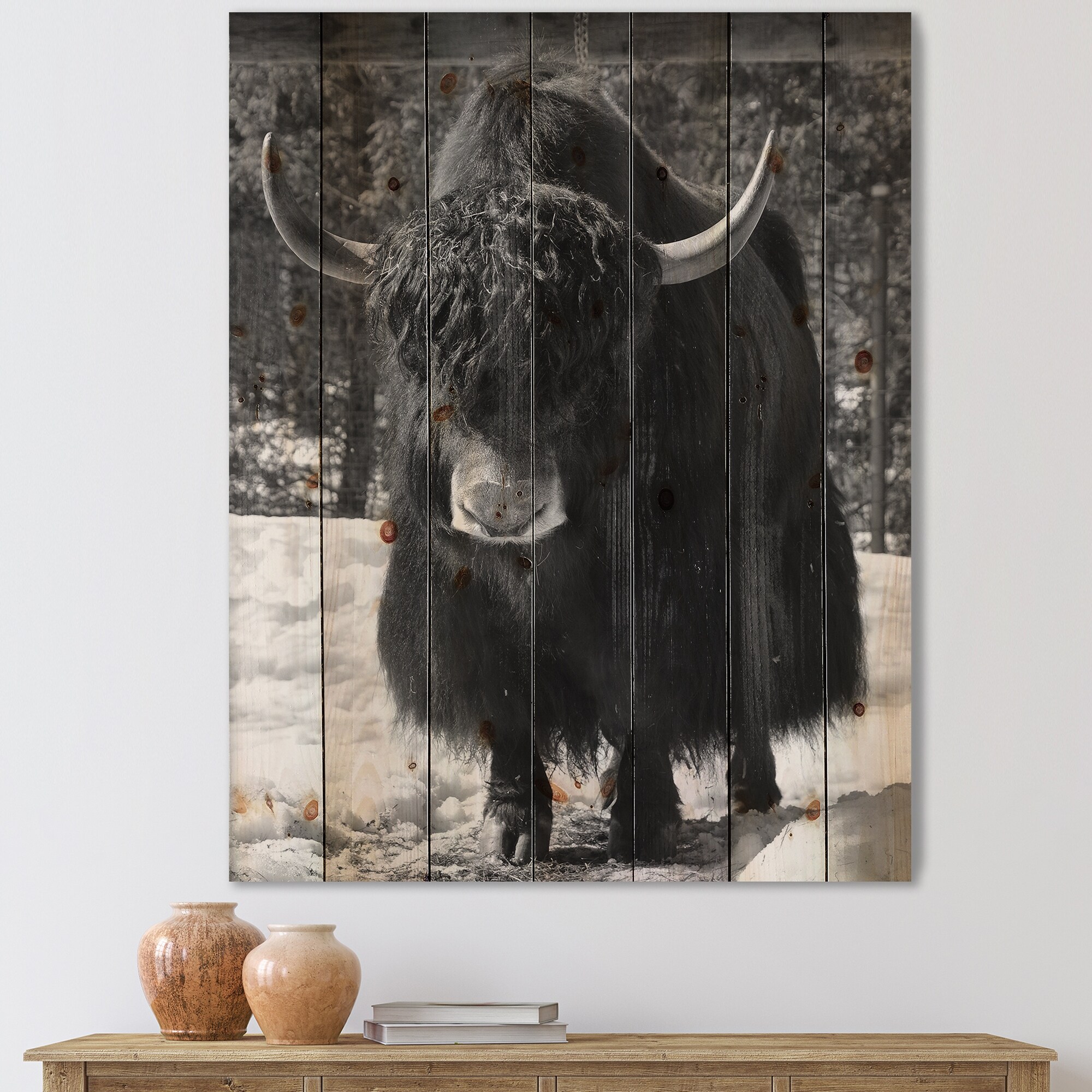 Designart 'Portrait Of Wild Bull in Winter Forest I' Farmhouse Print on Natural Pine Wood