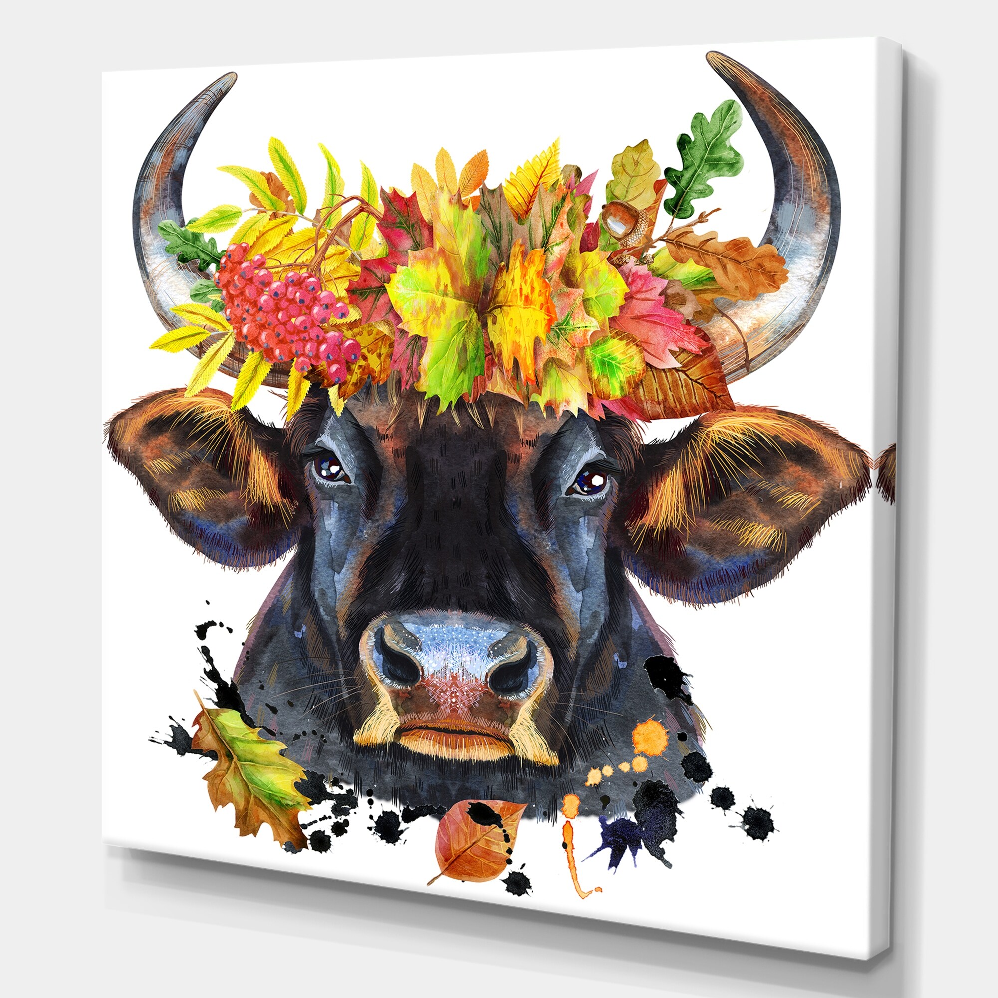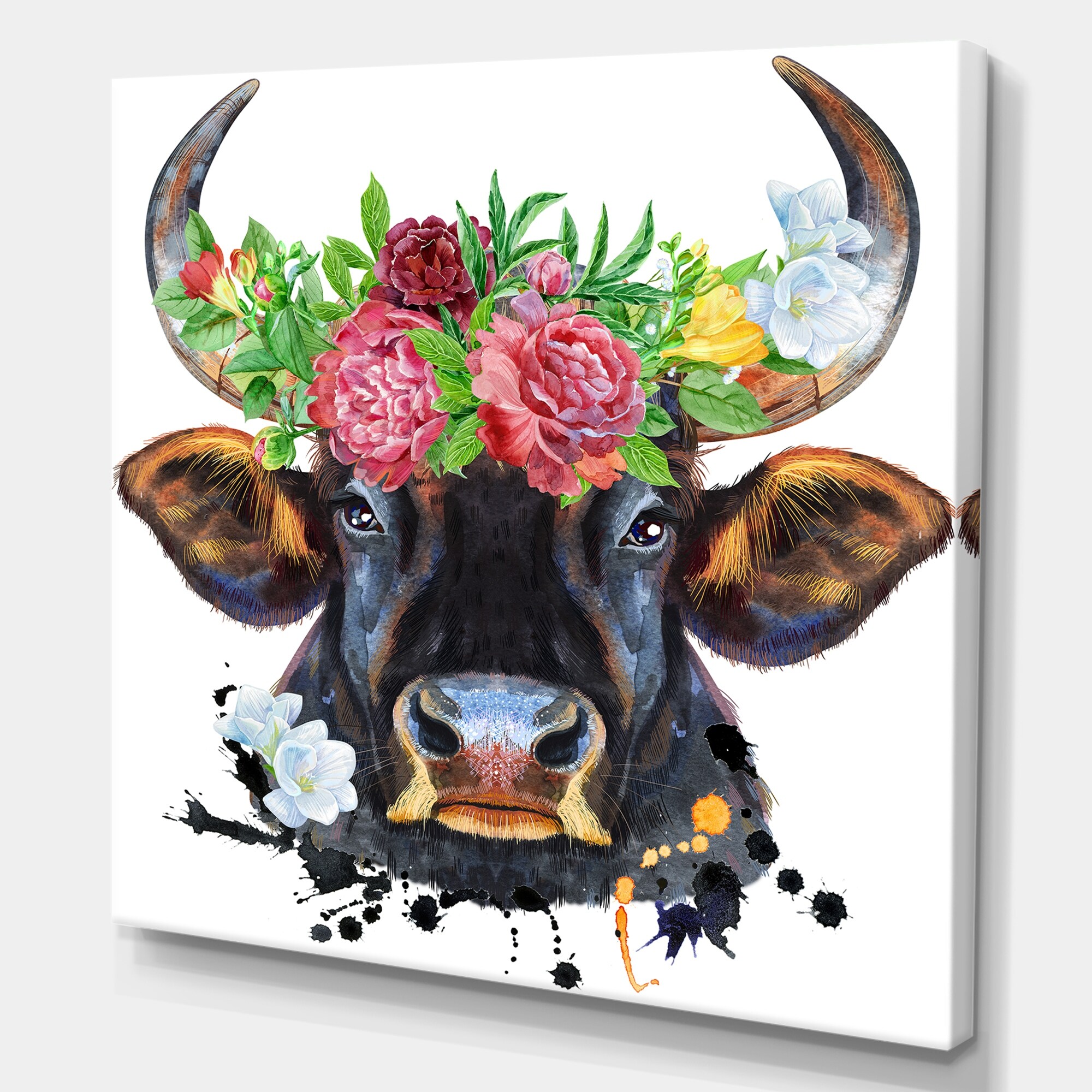 Designart "Watercolor Bull With Flower Wreath III" Animals Canvas Wall Art Print