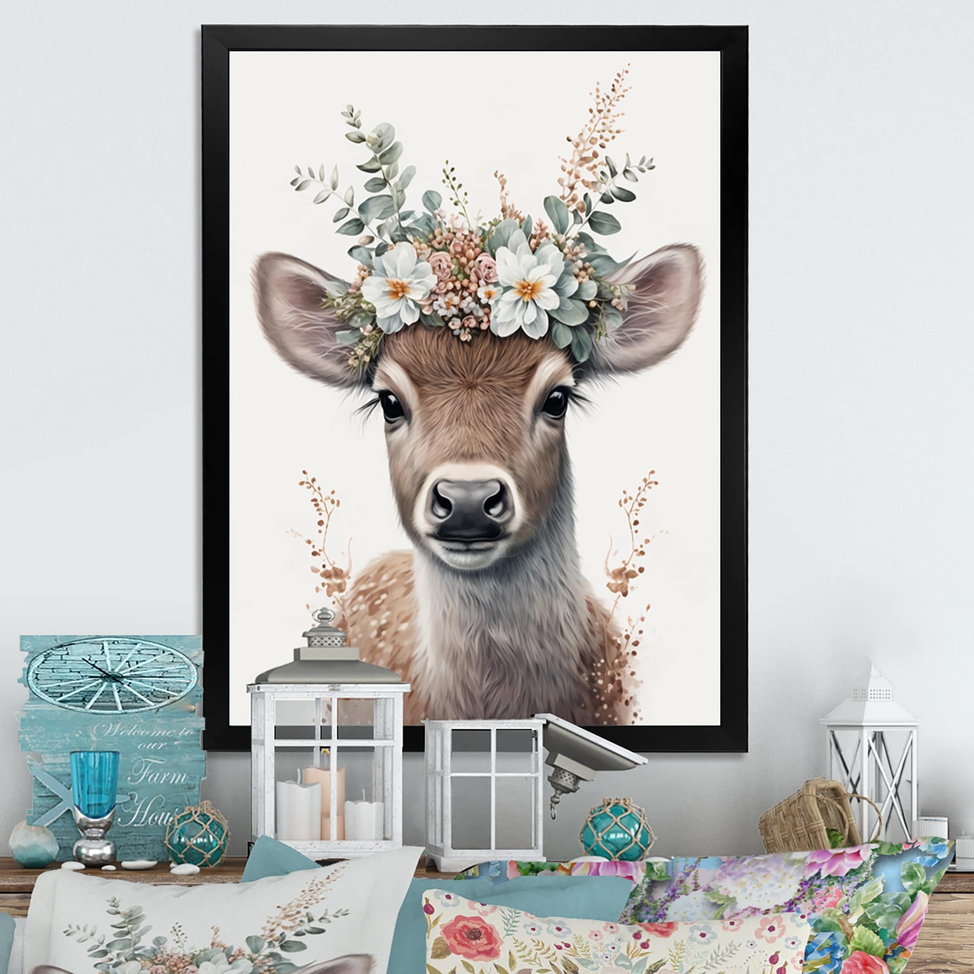 Designart "Cute Baby Bull With Floral Crown" Animals Framed Art Print