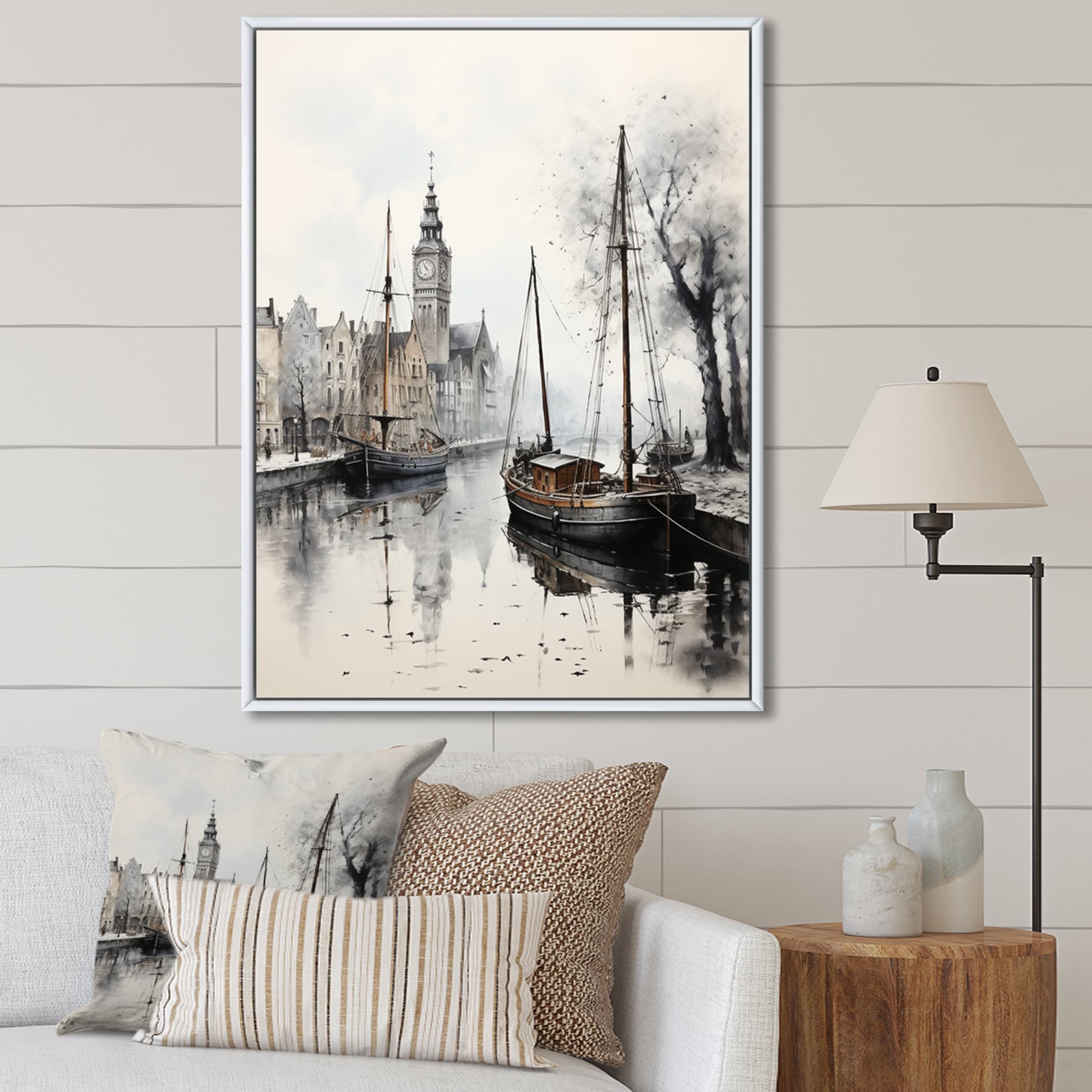 Designart "Grey Canal Reflections in Monochrome III" Canals Framed Canvas Wall Art