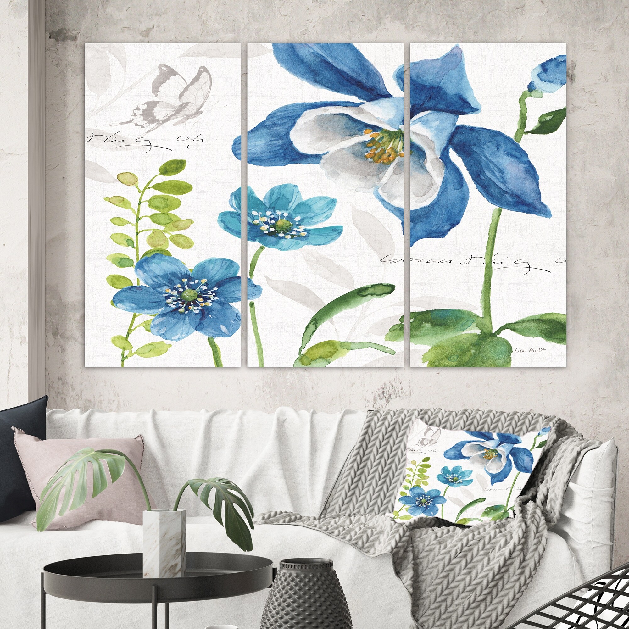 Designart "Blue Columbine Flowers With Butterfly" Cabin & Lodge Canvas Artwork Print