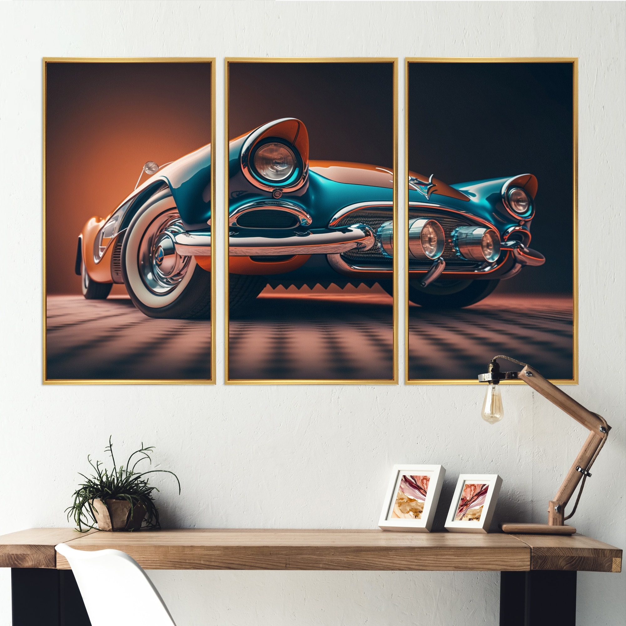 Designart "Close-up Of Classic Retro Car VIII" Retro Car Framed Canvas Wall Art Print - 3 Panels